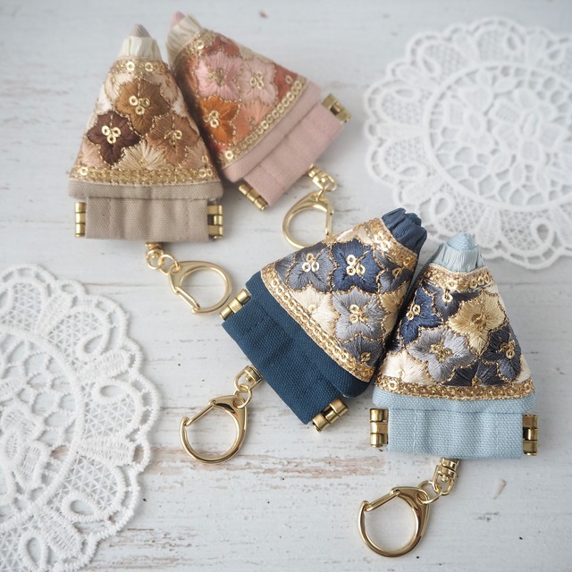 ころんと可愛い三角フォルムに、華やかなインド刺繍リボンを合わせたLink.hand-madeのミニテトラポーチ。 5cmのバネ口が付いた小さなポーチは、ピアスや薬など、小さなものをそっと収納できます。 キーホルダー金具付きで、バッグやスマホショルダーに付ければアクセサリー感覚で楽しめるデザイン♪ 小さいけれど存在感たっぷりで、持ち歩くたび気分が上がるアイテムです。 ※発送時は折りたたんでお届けいたします。形を整えてご使用ください。 ❁━━━━━━━━━━━━━━━━━❁ 生地…オックス生地 カラー…A ブルー B ラベンダー 内布…ナチュラル無地 サイズ…全長約 7×5cm バネ口…5cm 重さ…約17g キーホルダー金具付き ❁━━━━━━━━━━━━━━━━━❁ 【ご購入前にご確認ください】 ・綺麗なリボンを選んで製作しておりますが、 インド刺繍リボンの特性上、ほつれやスパンコールの欠けが見られる場合がございます。 日本製とは異なる品質となりますことを、あらかじめご了承のうえご検討くださいませ。 ・【こちらの商品は写真に写っている現品をそのままお届けいたします。】 ❁━━━━━━━━━━━━━━━━━❁ 【ラッピングについて】 ・プレゼントにもお使いいただけるよう、心を込めてラッピングしてお届けします。 ラッピング例は商品ページの写真をご覧ください。 ・ラッピング資材の仕入れ状況により、予告なくデザインが変更となる場合がございます。 あらかじめご了承ください。 ❁━━━━━━━━━━━━━━━━━❁ 【有料ラッピング(300円)について】 ・オーガンジー巾着を使用した有料ラッピングもご用意しております。 ご希望の方はカートに追加してご購入ください。 ラッピングのイメージは写真をご確認ください。 ・複数ご購入の場合、まとめてラッピングをご希望の方は備考欄にてお知らせください。 ※特にご希望がない場合は、基本的に1点ずつ個別に梱包しております。 ※ラッピングにはオーガンジー巾着を使用しており、サイズの都合によりおまとめできる個数に限りがあります。ご希望に添えない場合はご相談させていただくことがございます。