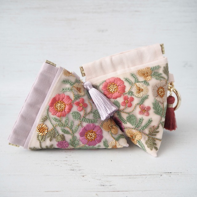 華やかなインド刺繍リボンを主役に、手に取るたび気分が上がる一品に仕立てました。