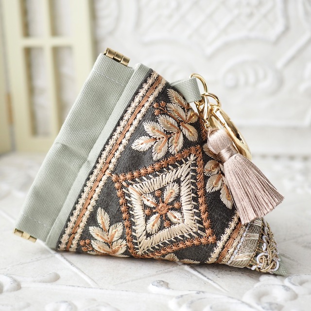 テトラポーチ 三角のフォルムが目を惹く、Link.hand-madeの看板アイテム「テトラポーチ」 華やかなインド刺繍リボンを主役に、手に取るたび気分が上がる一品に仕立てました。 小さめながらもリップやアクセサリーなどの小物がしっかり入る実用性も◎ バッグやスマホショルダーに取り付けられるカラビナ付きで、毎日のお出かけに寄り添います。 ご自分用にはもちろん、特別な贈り物としてもおすすめです。 ※発送時は折りたたんでお届けいたします。形を整えてご使用ください。 ❁━━━━━━━━━━━━━━━━━❁ 生地…オックス生地 カラー…セージグリーン 内布…ナチュラル無地 サイズ…全長約 12×10cm バネ口…10cm 重さ…約40g カラビナ付き・タッセル取り外し可 ❁━━━━━━━━━━━━━━━━━❁ 【ご購入前にご確認ください】 ・綺麗なリボンを選んで製作しておりますが、 インド刺繍リボンの特性上、ほつれやスパンコールの欠けが見られる場合がございます。 日本製とは異なる品質となりますことを、あらかじめご了承のうえご検討くださいませ。 ・リボンの柄の出方には個体差があります。 世界にひとつだけの仕上がりをお楽しみください。 ❁━━━━━━━━━━━━━━━━━❁ 【ラッピングについて】 ・プレゼントにもお使いいただけるよう、心を込めてラッピングしてお届けします。 ラッピング例は商品ページの写真をご覧ください。 ・ラッピング資材の仕入れ状況により、予告なくデザインが変更となる場合がございます。 あらかじめご了承ください。 ❁━━━━━━━━━━━━━━━━━❁ 【有料ラッピング(300円)について】 ・オーガンジー巾着を使用した有料ラッピングもご用意しております。 ご希望の方はカートに追加してご購入ください。 ラッピングのイメージは写真をご確認ください。 ・複数ご購入の場合、まとめてラッピングをご希望の方は備考欄にてお知らせください。 ※特にご希望がない場合は、基本的に1点ずつ個別に梱包しております。 ※ラッピングにはオーガンジー巾着を使用しており、サイズの都合によりおまとめできる個数に限りがあります。ご希望に添えない場合はご相談させていただくことがございます。