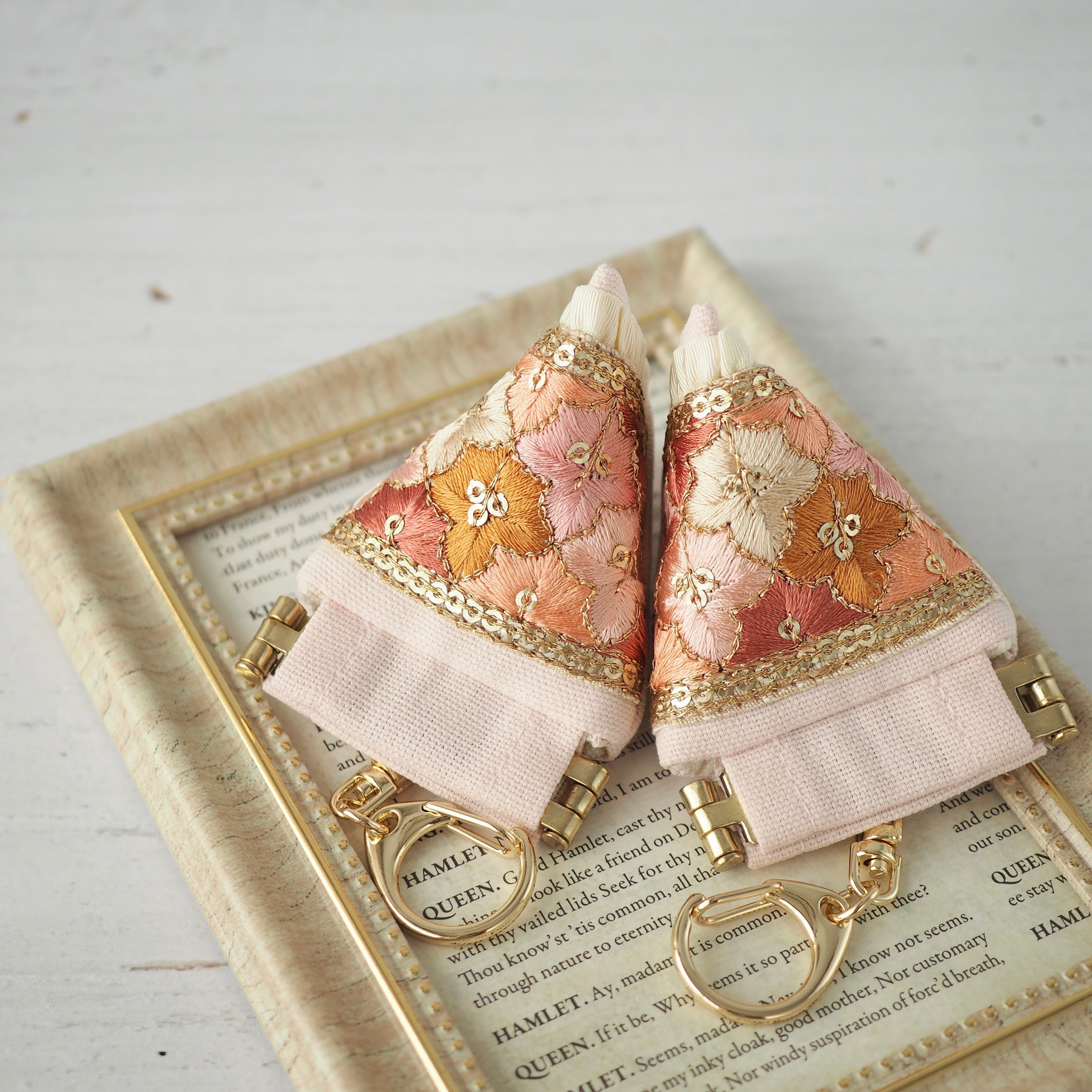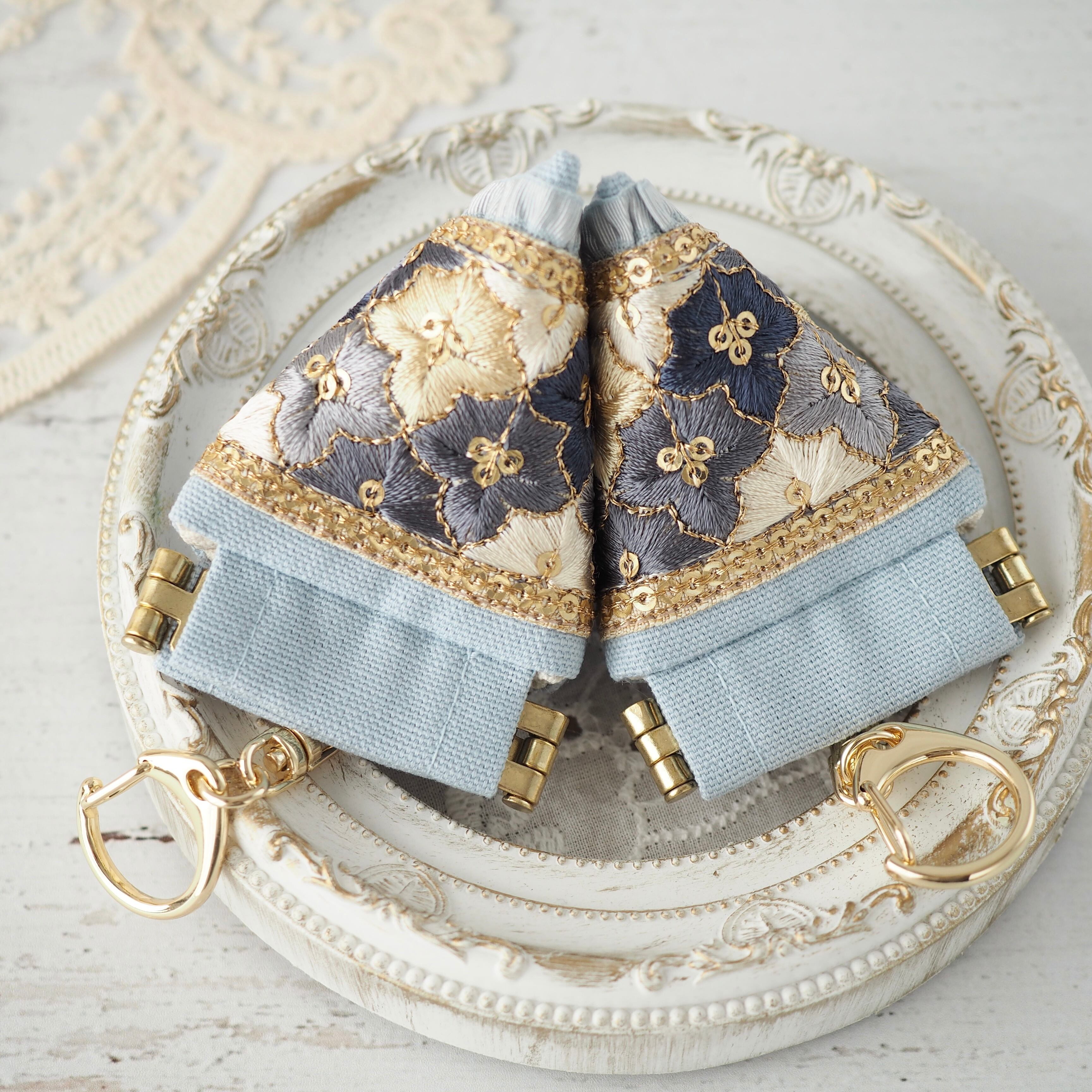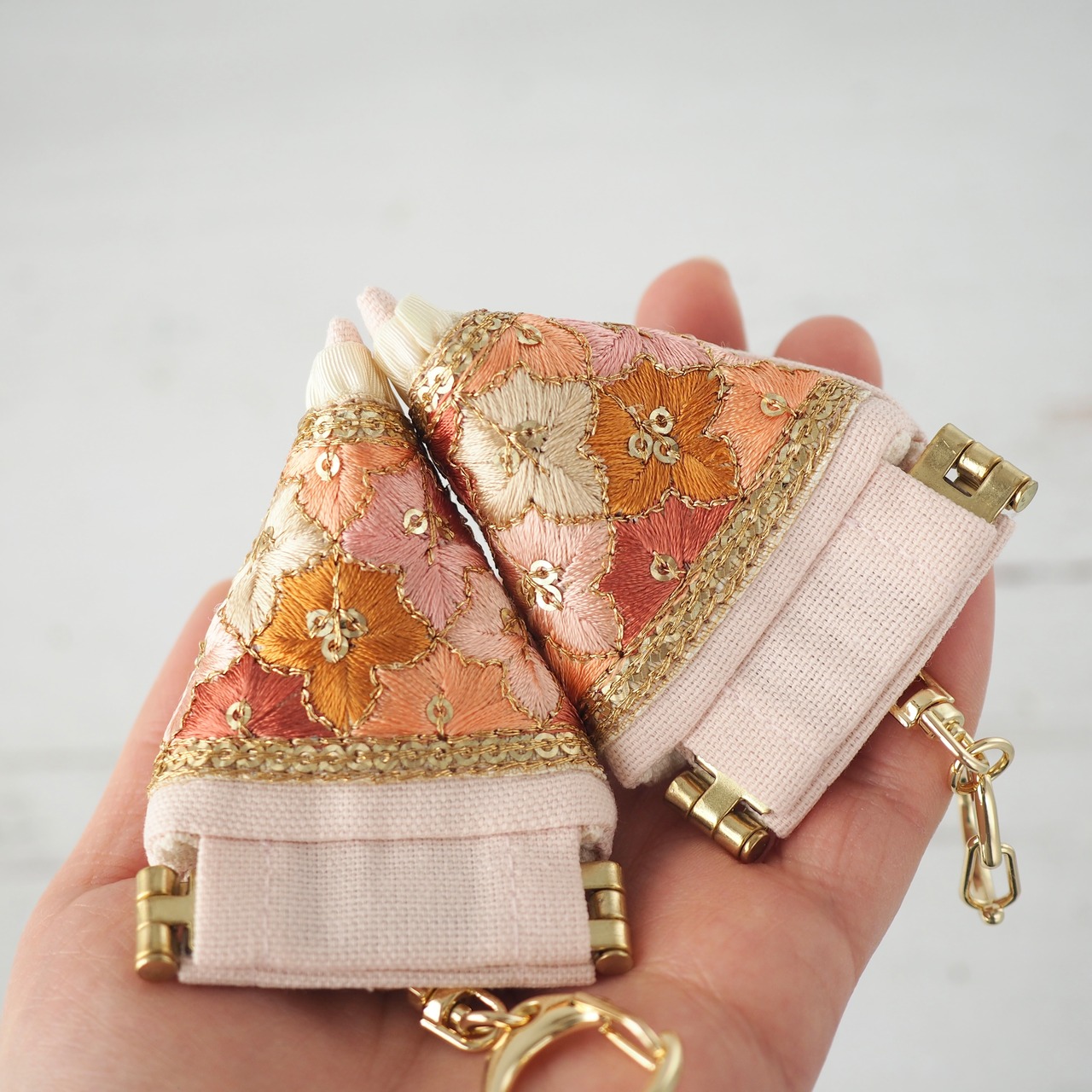 ころんと可愛い三角フォルムに、華やかなインド刺繍リボンを合わせたLink.hand-madeのミニテトラポーチ。