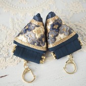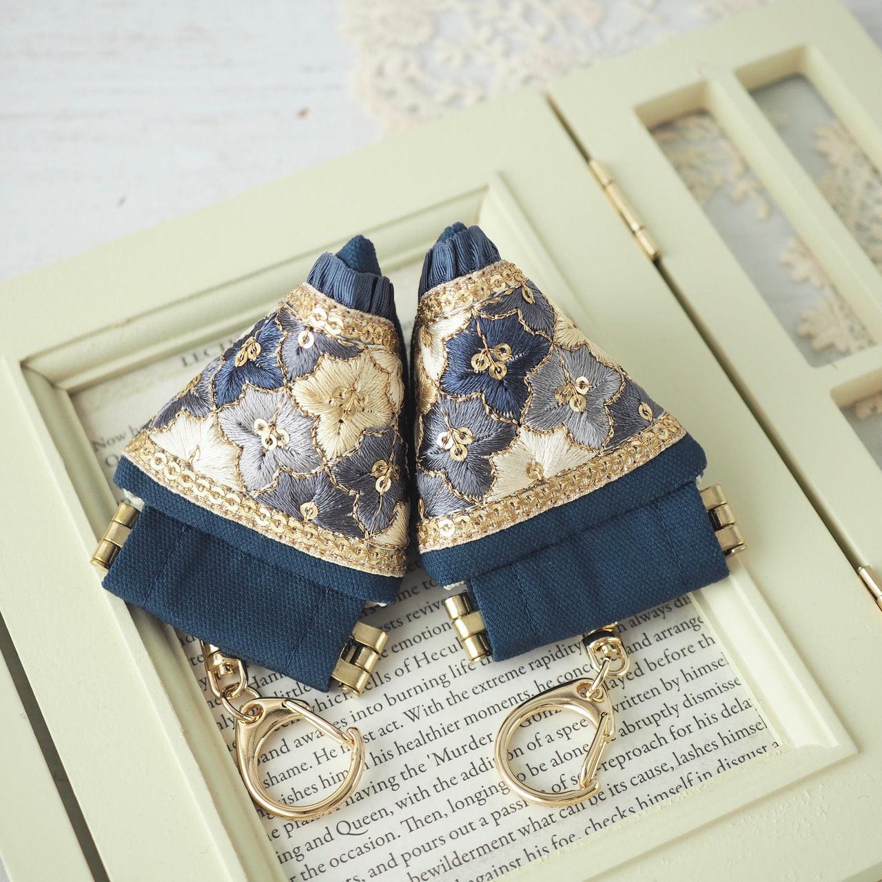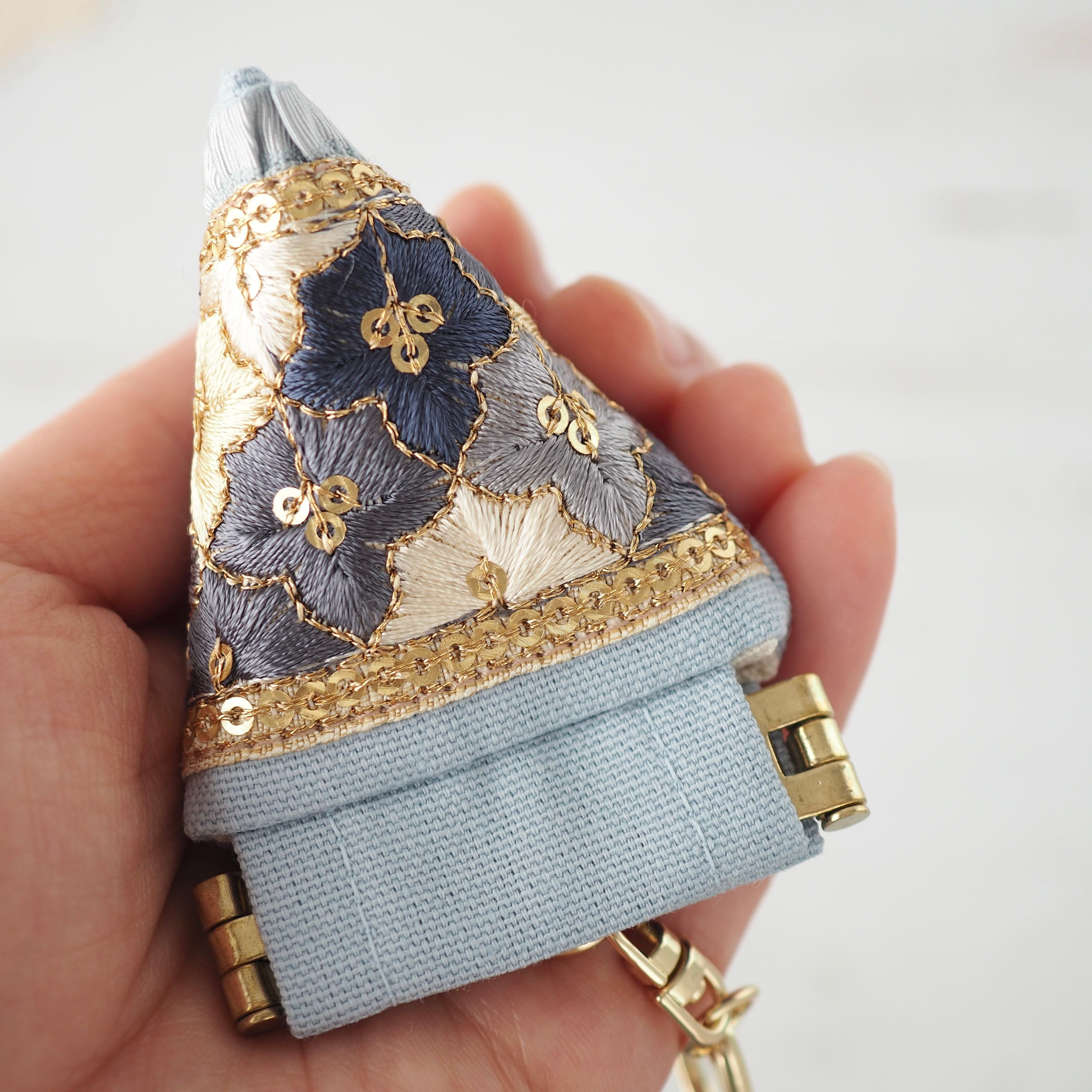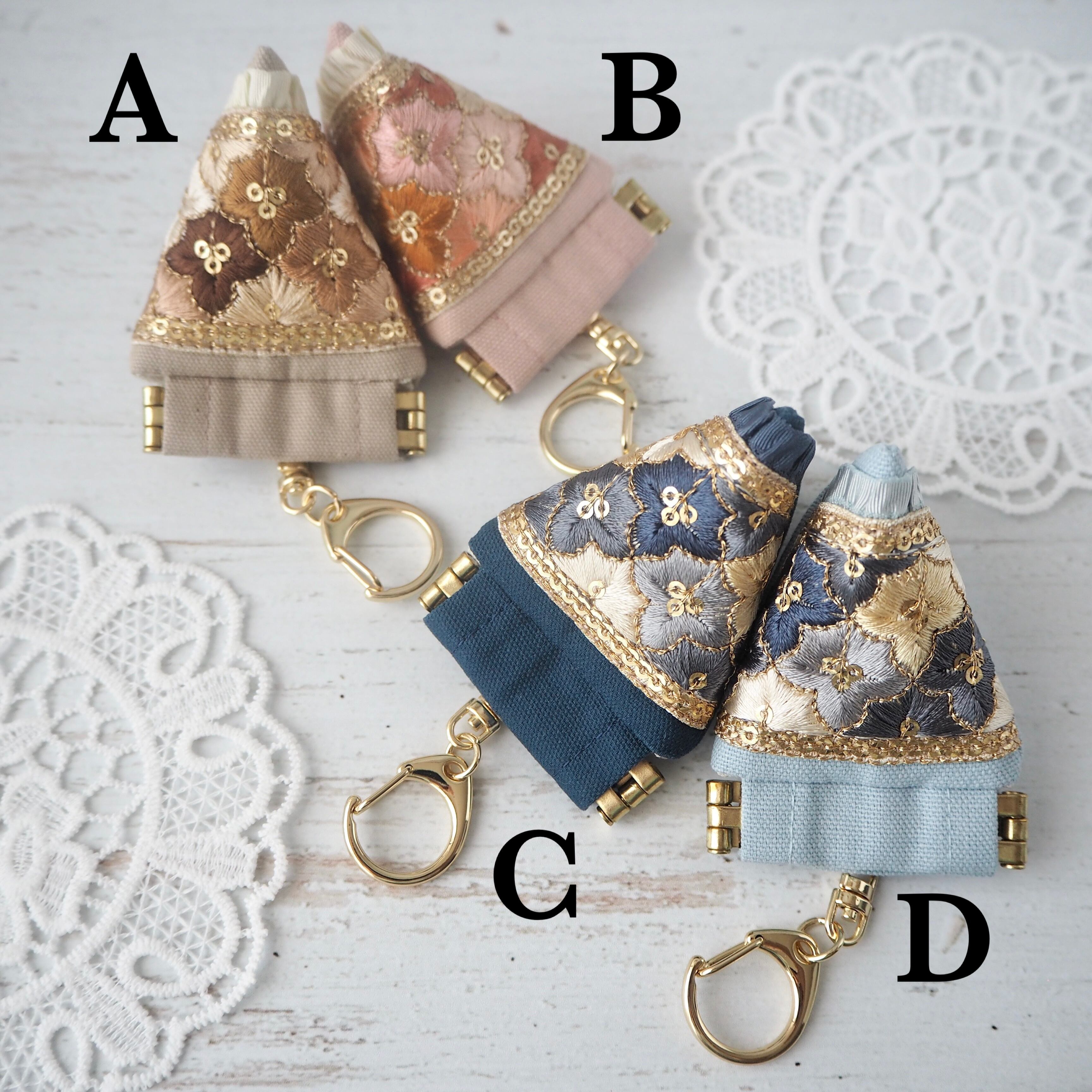 ころんと可愛い三角フォルムに、華やかなインド刺繍リボンを合わせたLink.hand-madeのミニテトラポーチ。