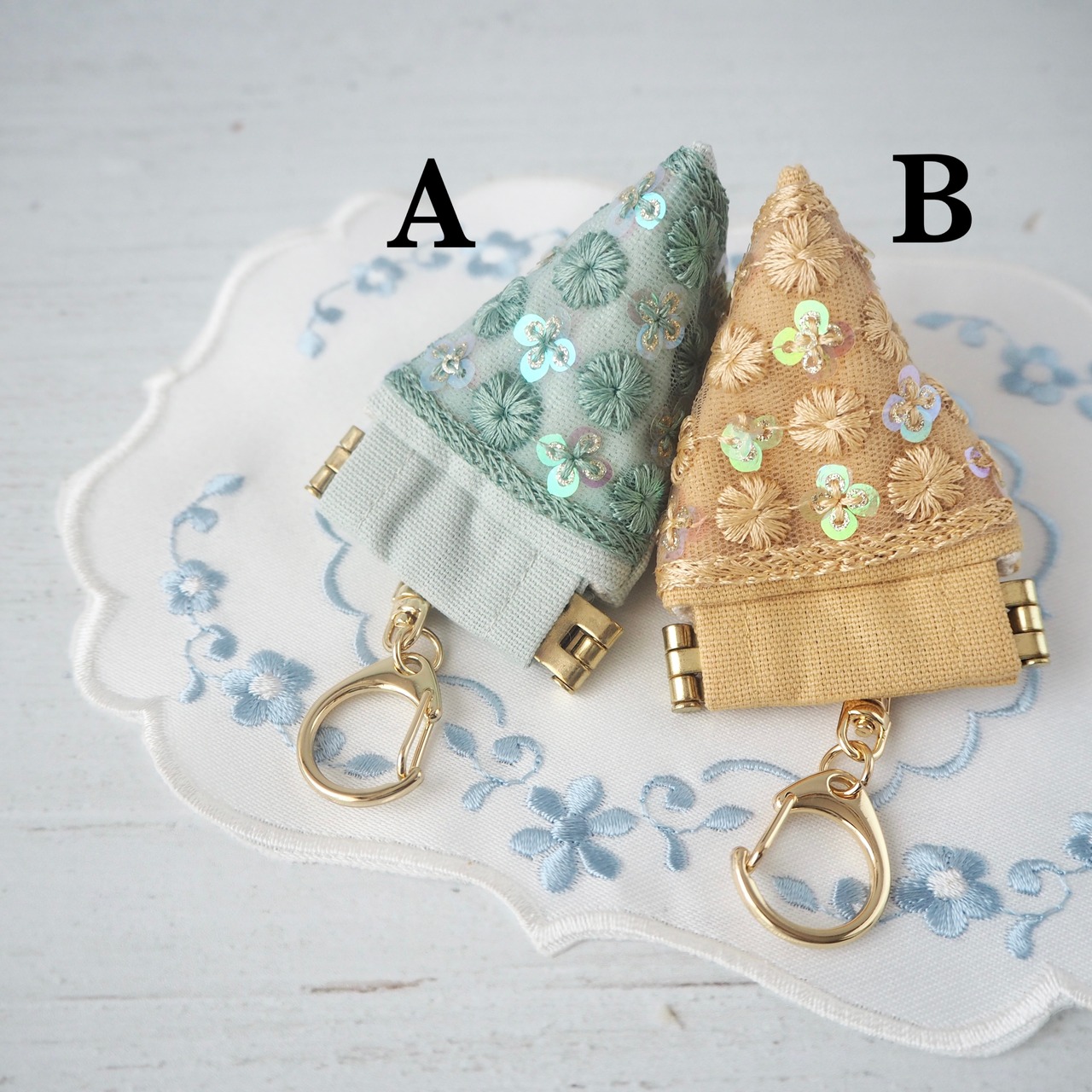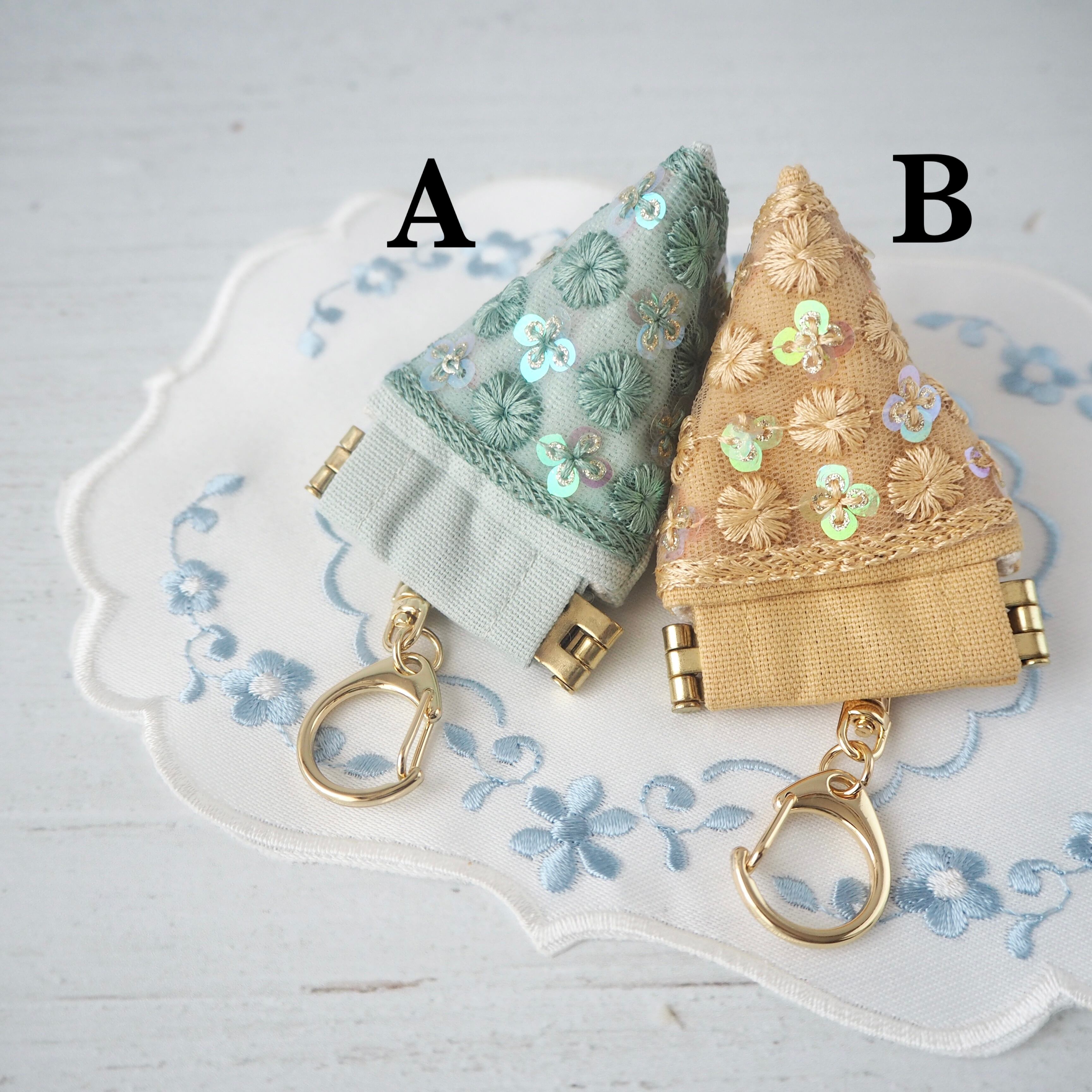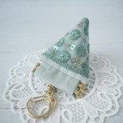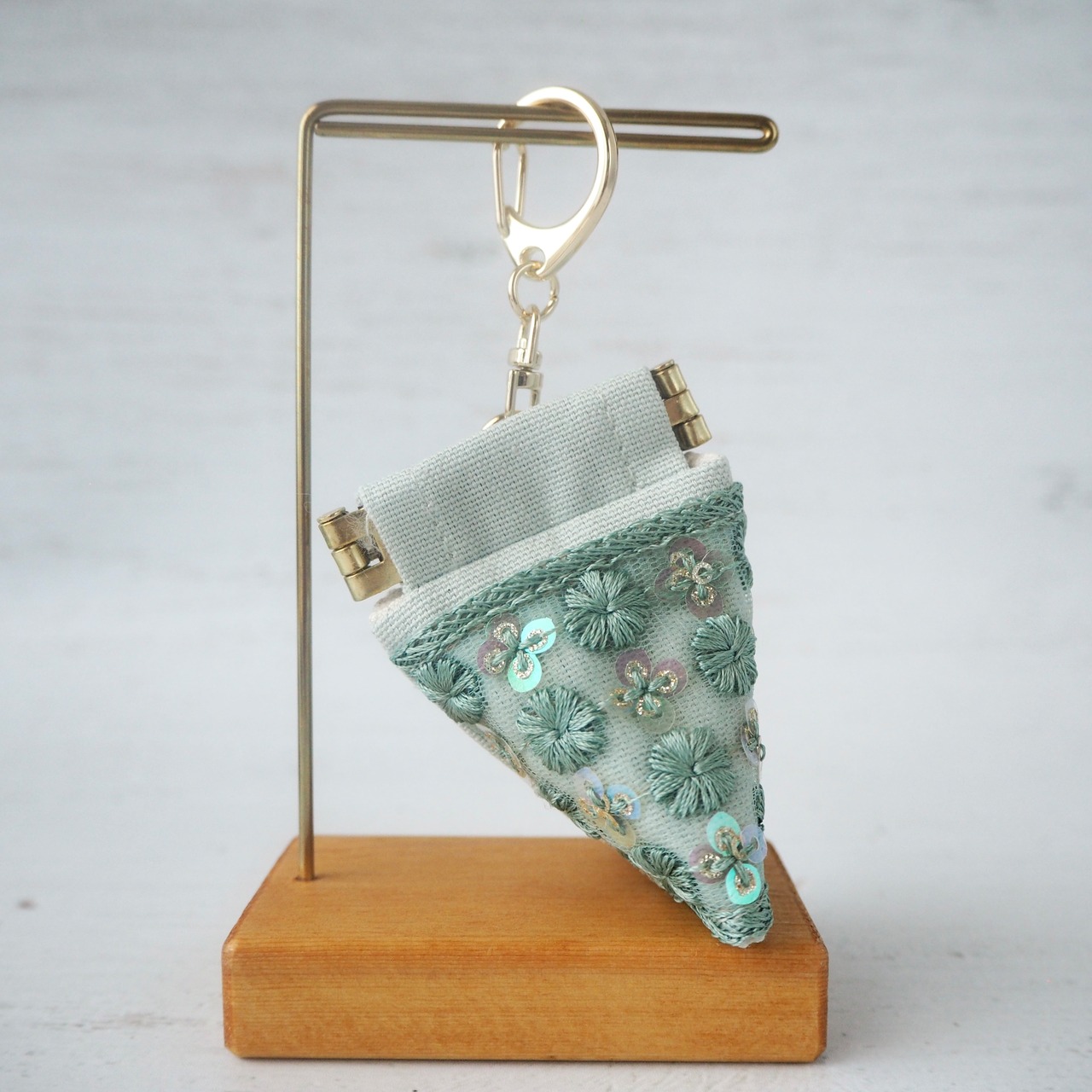 ころんと可愛い三角フォルムに、華やかなインド刺繍リボンを合わせたLink.hand-madeのミニテトラポーチ。