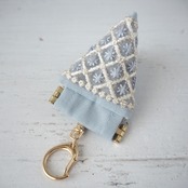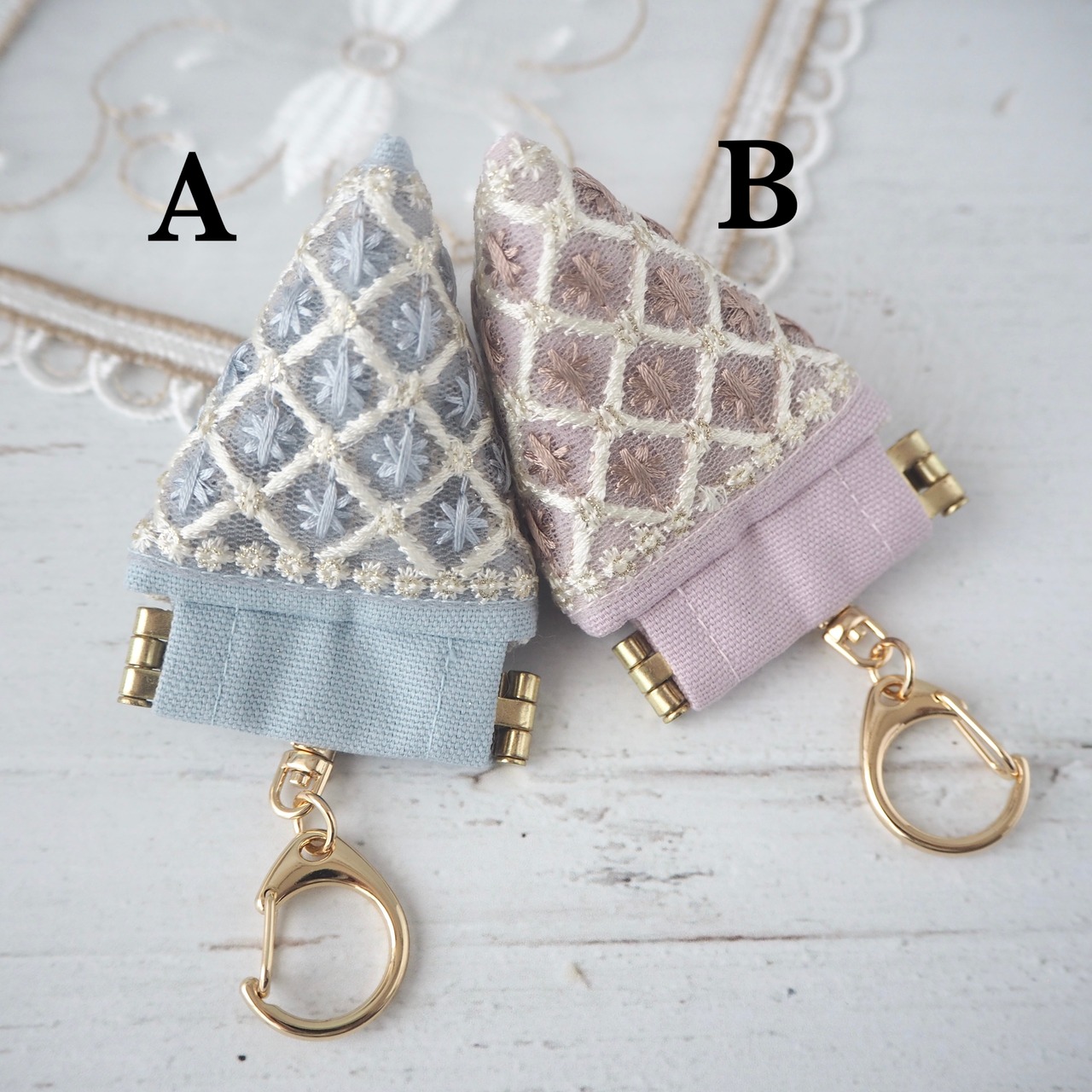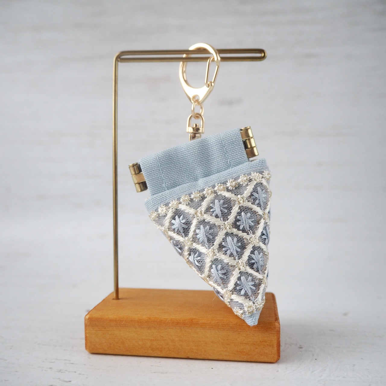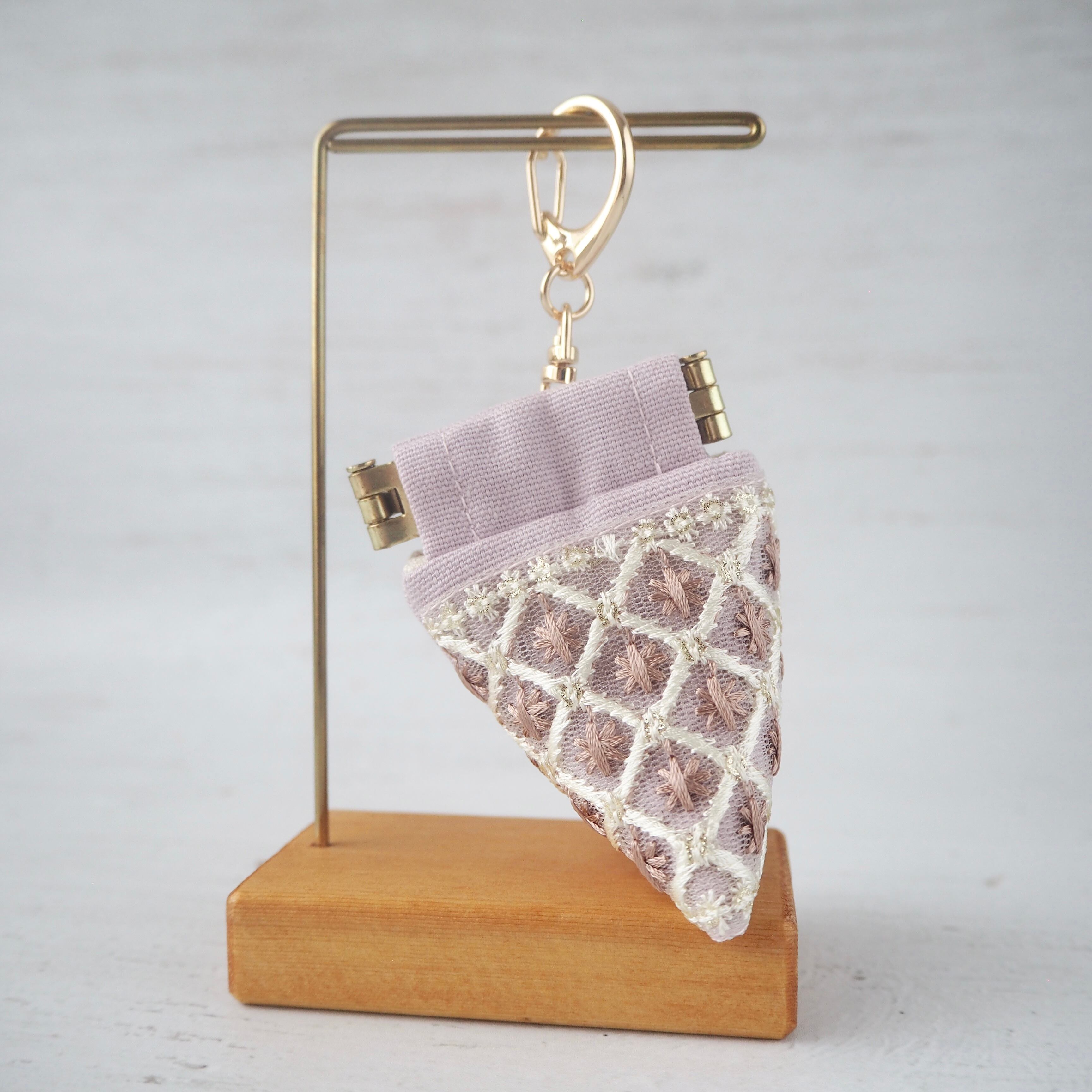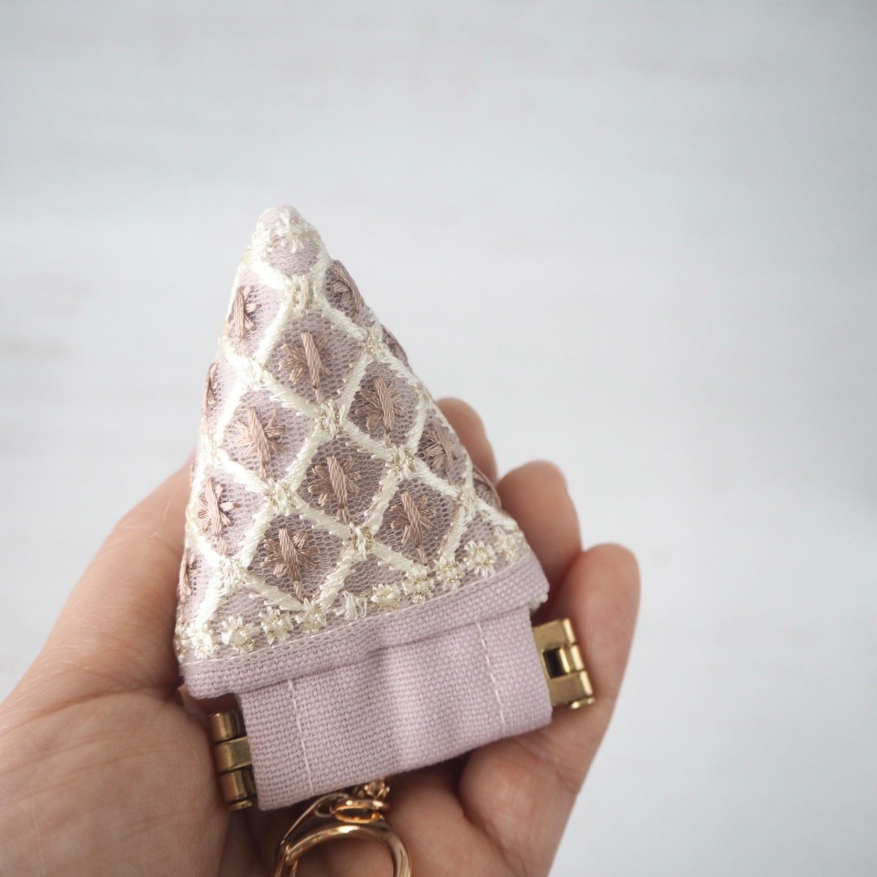 ころんと可愛い三角フォルムに、華やかなインド刺繍リボンを合わせたLink.hand-madeのミニテトラポーチ。