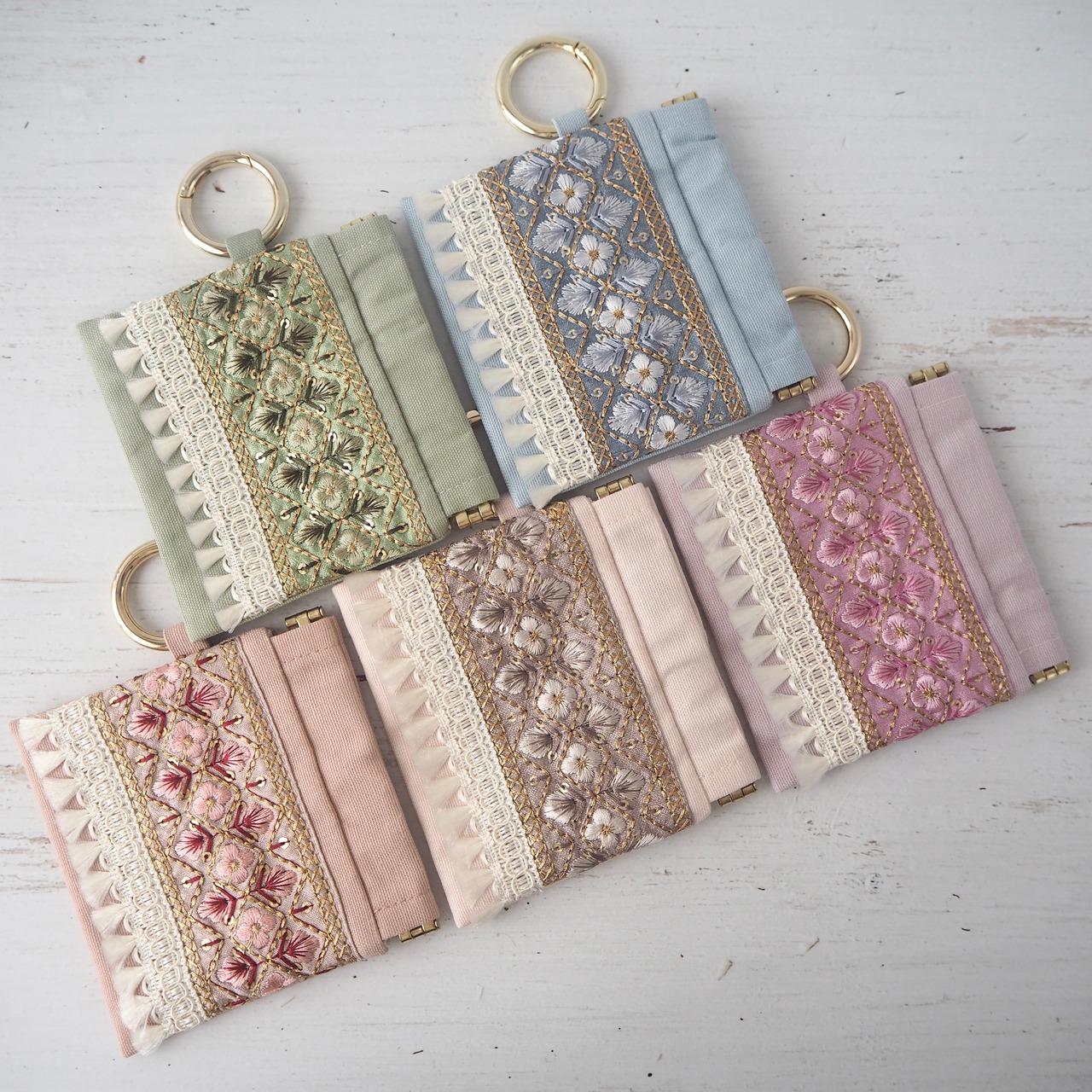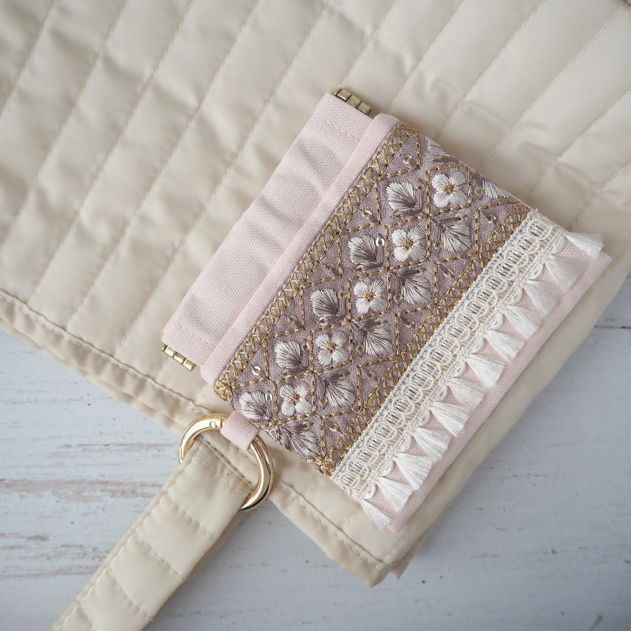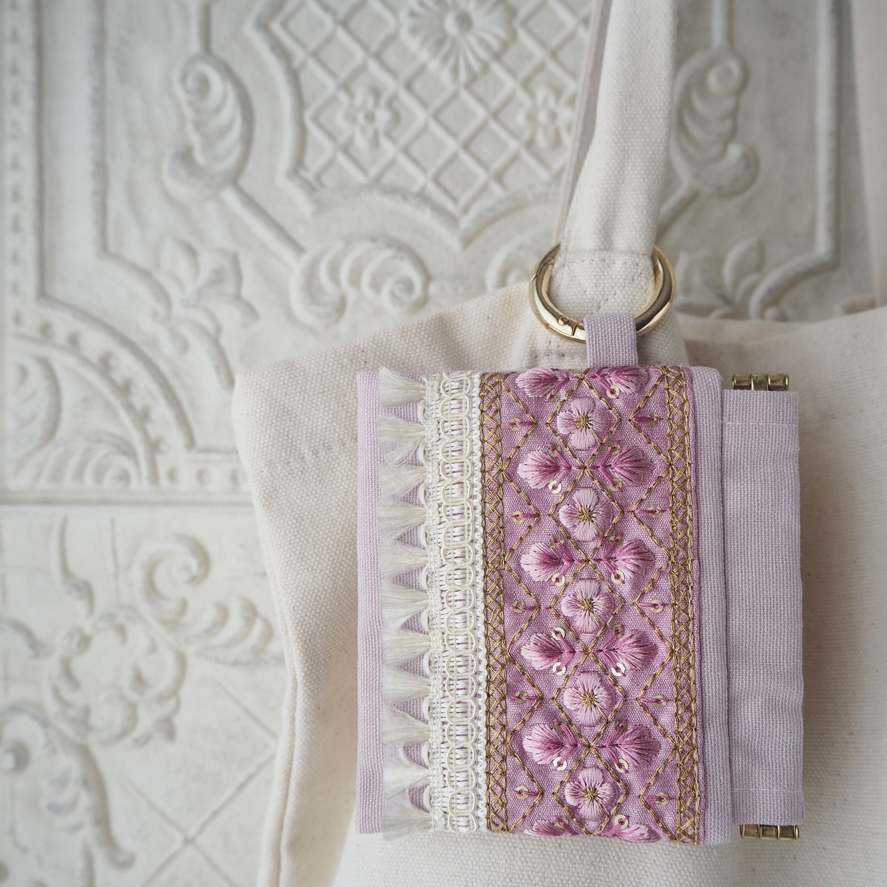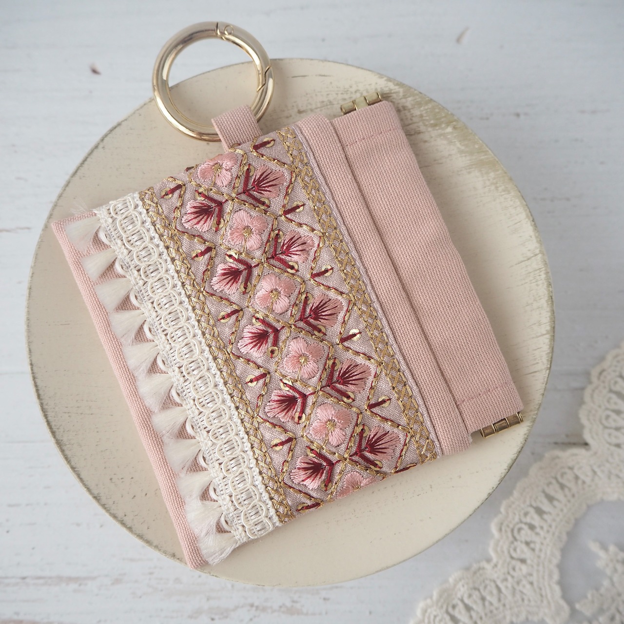 華やかなインド刺繍リボンを主役にした、大人可愛いミニポーチ。