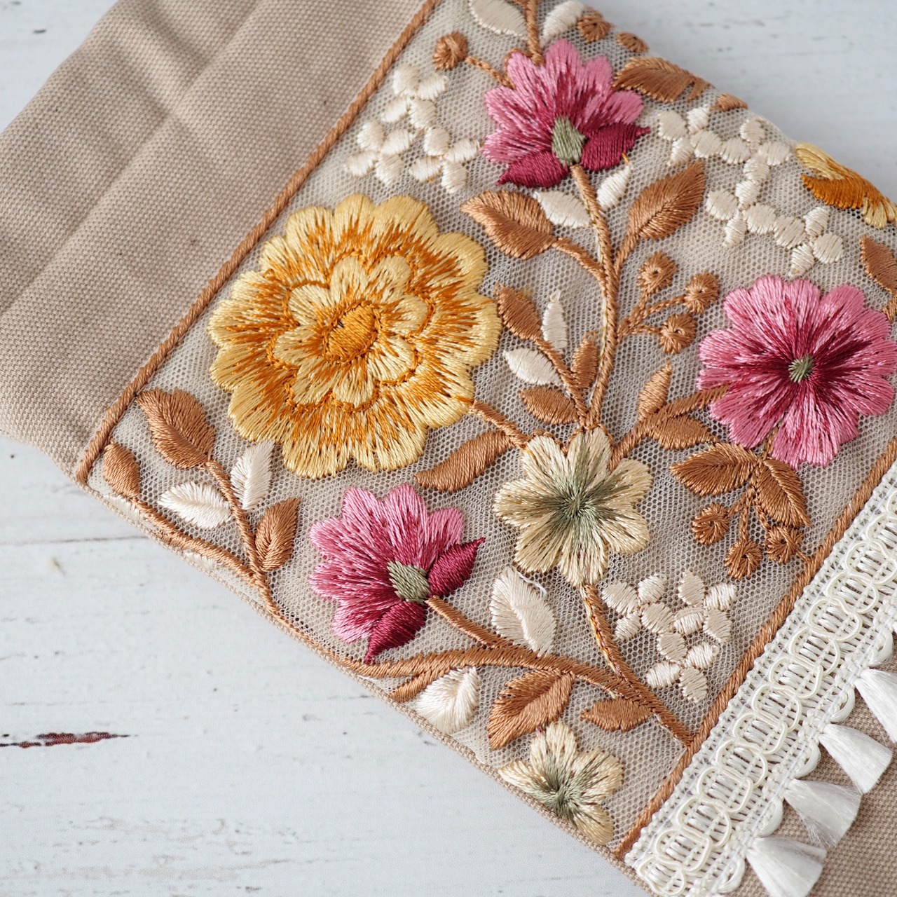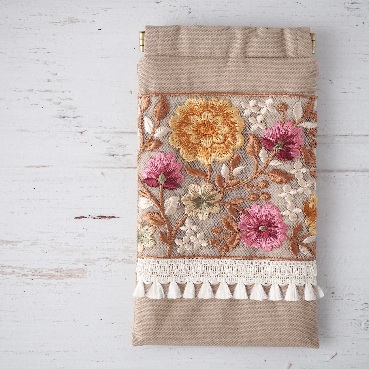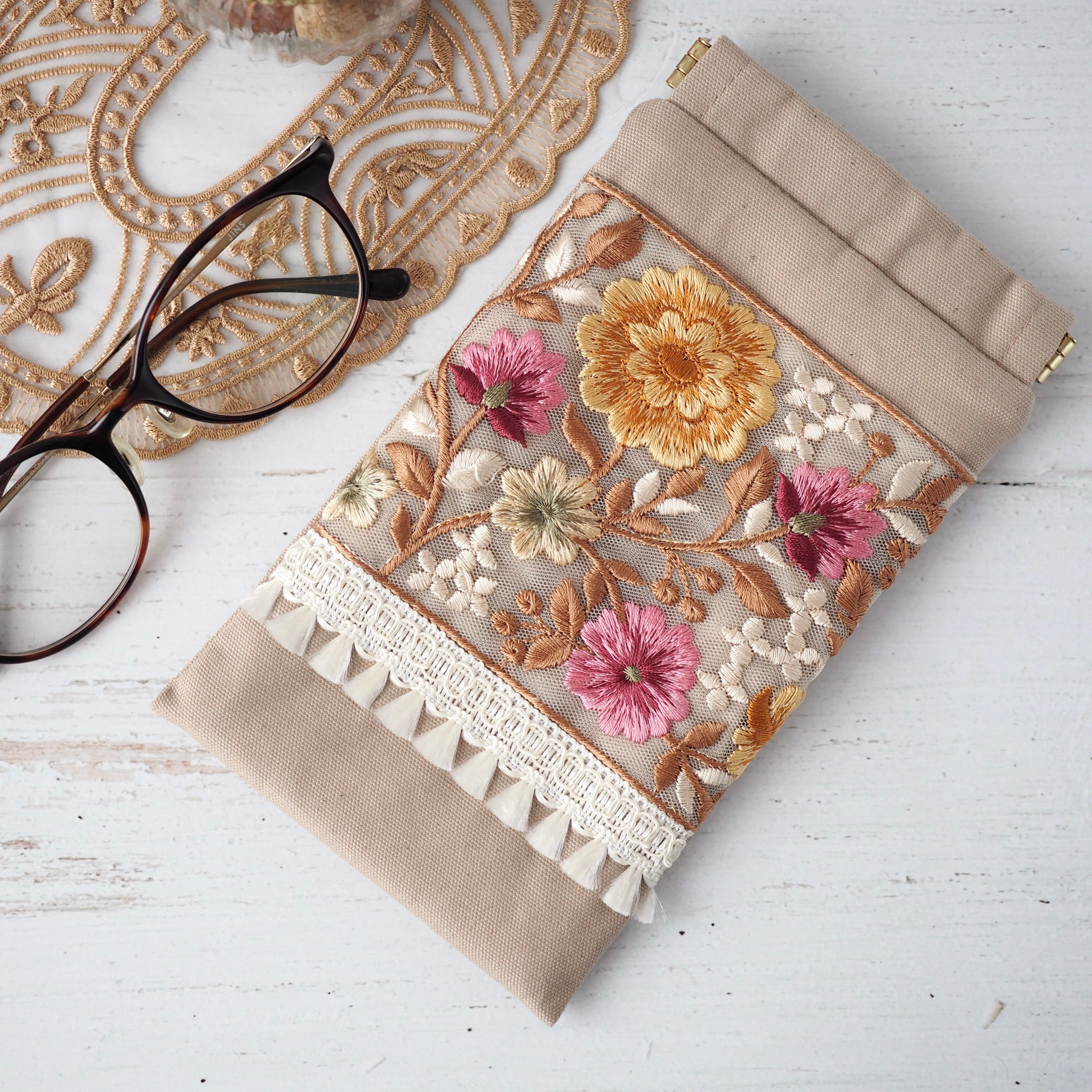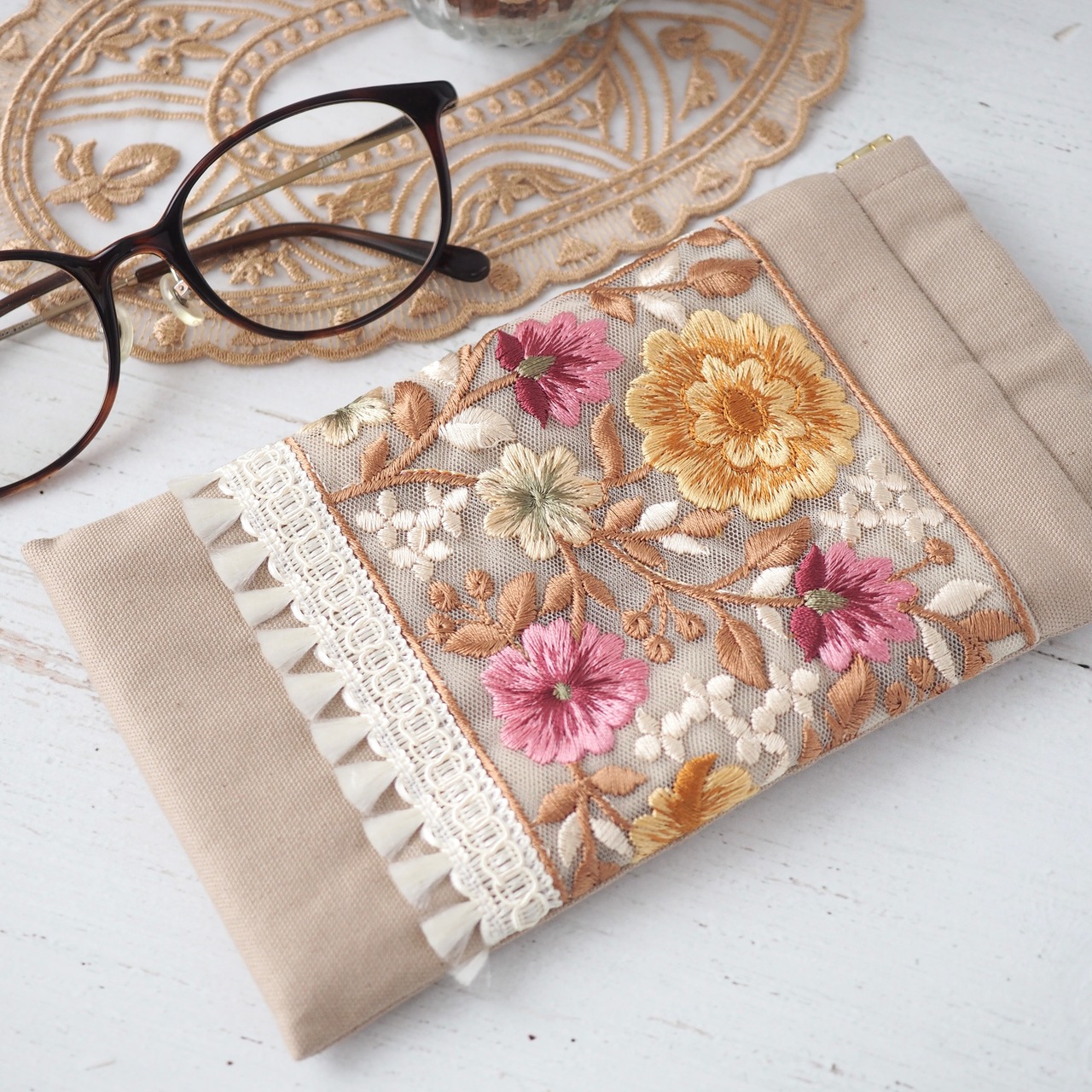 インド刺繍リボンとやわらかなカラーの生地を組み合わせた、ふんわり軽やかなメガネケースです。