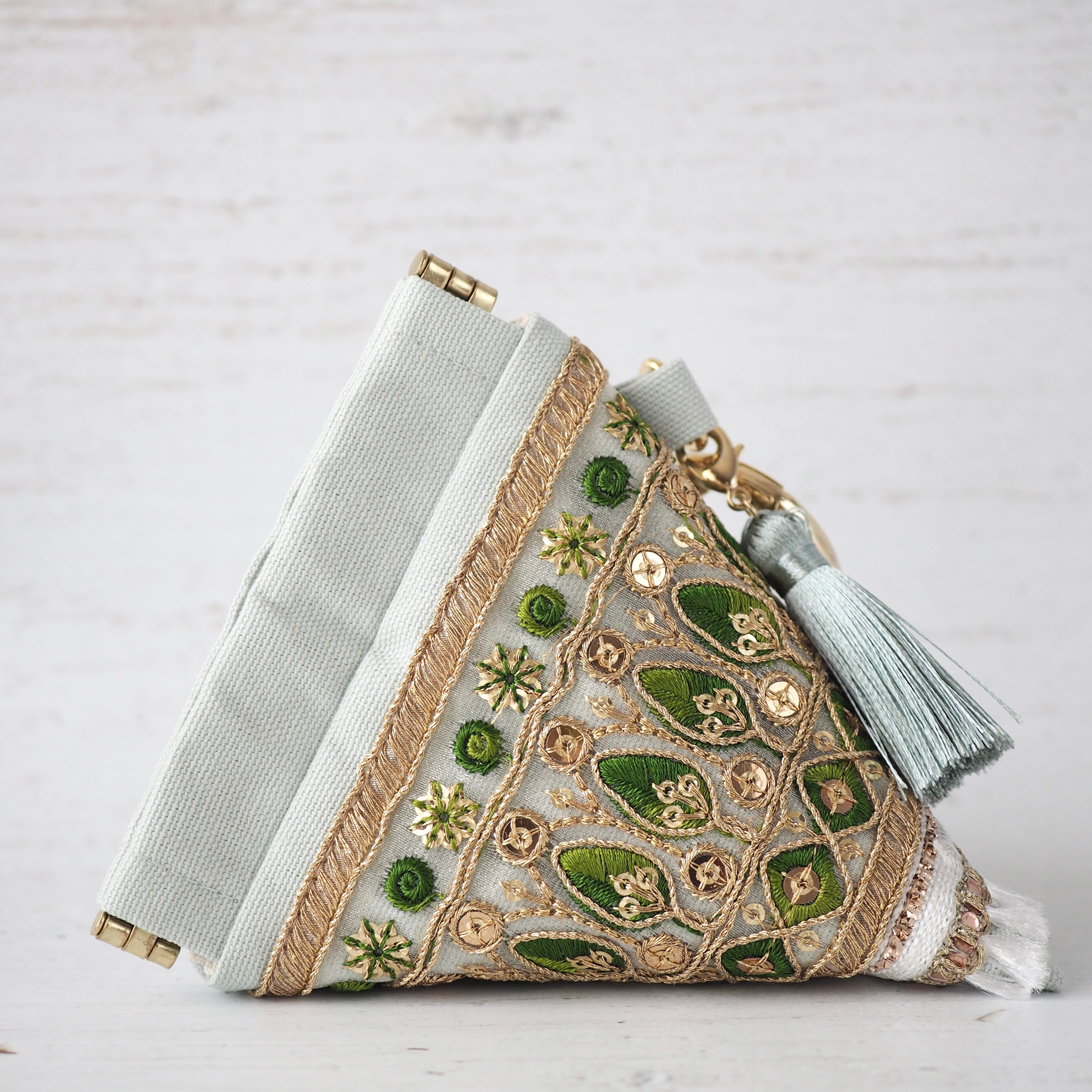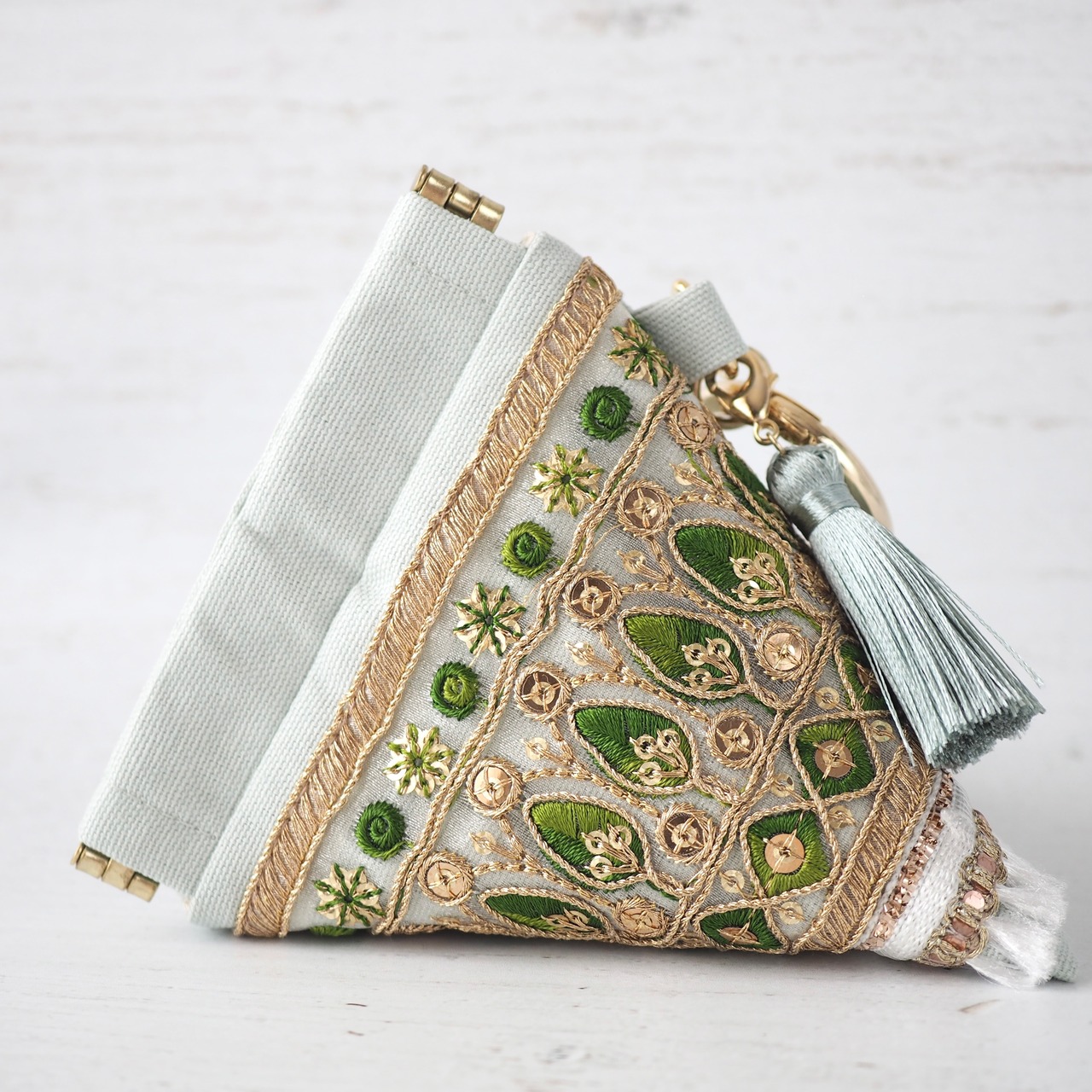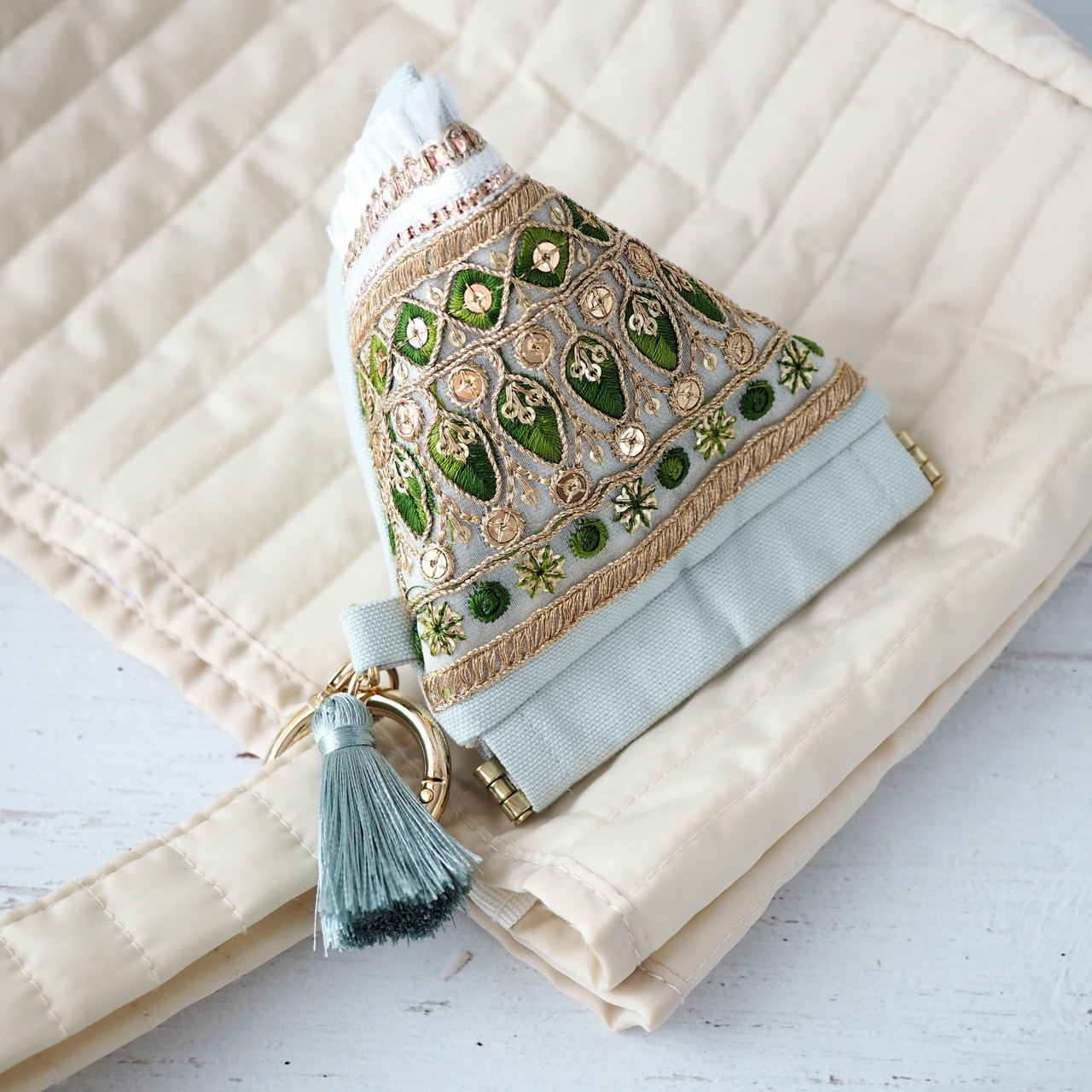 華やかなインド刺繍リボンを主役に、手に取るたび気分が上がる一品に仕立てました。