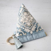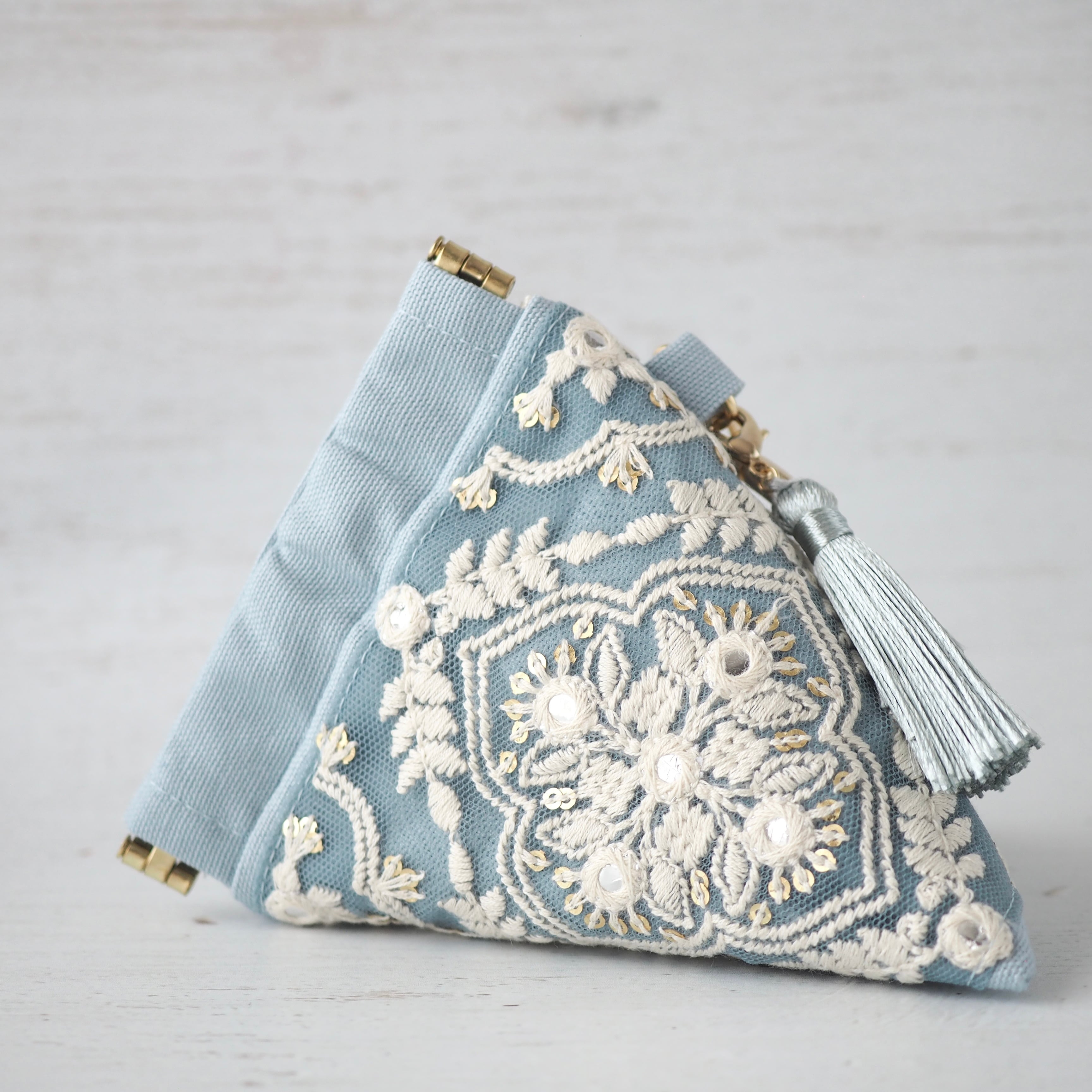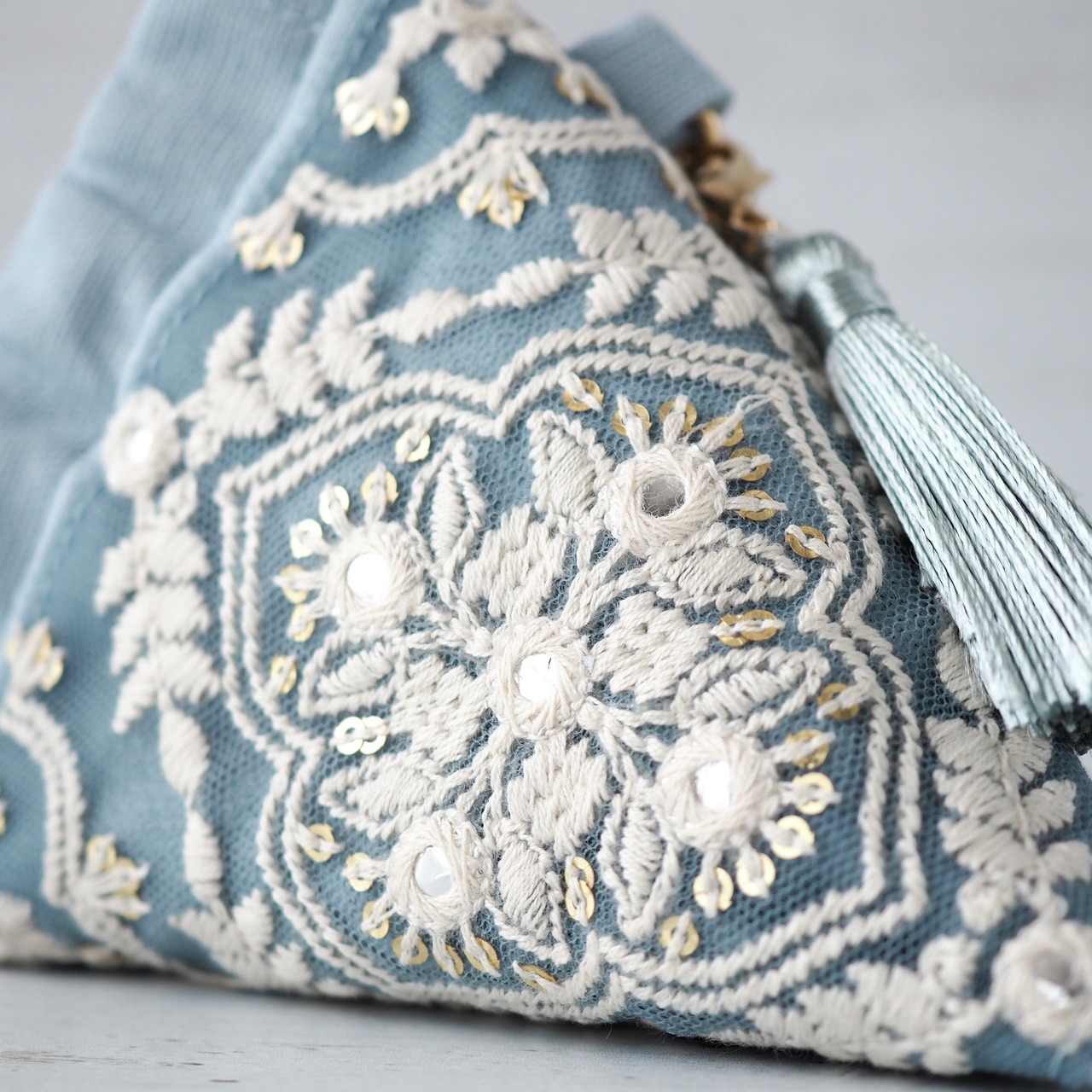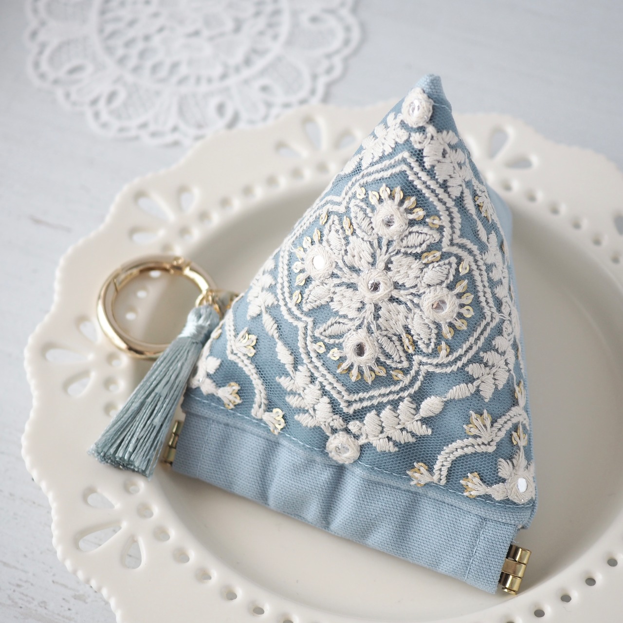 華やかなインド刺繍リボンを主役に、手に取るたび気分が上がる一品に仕立てました。
