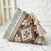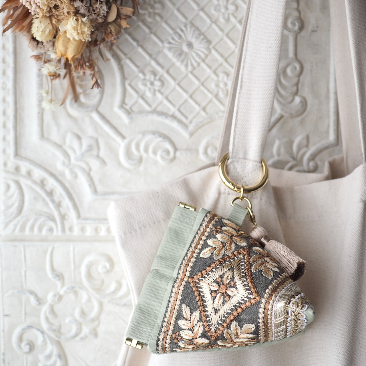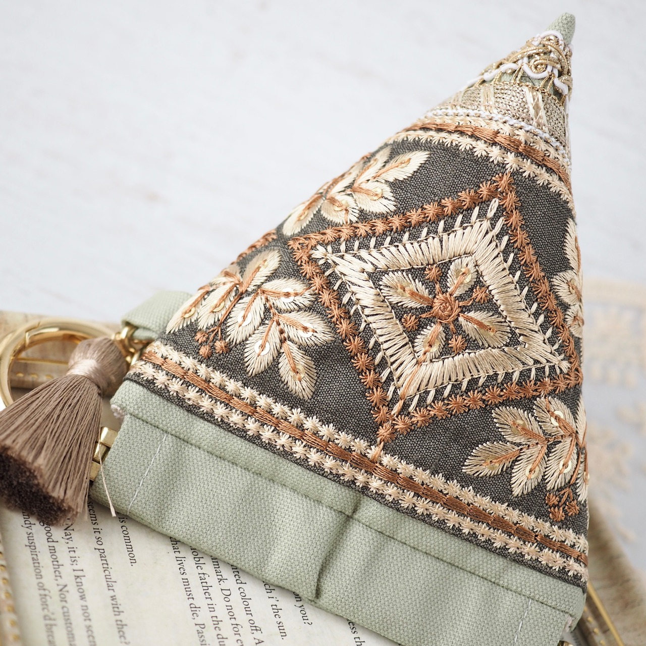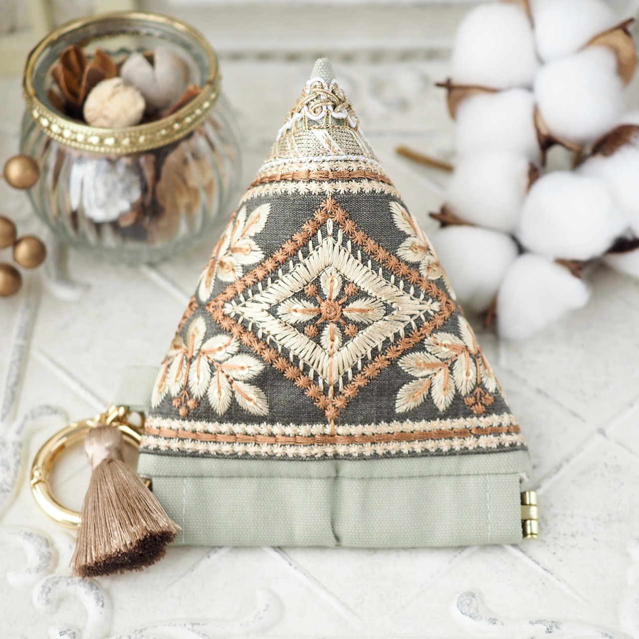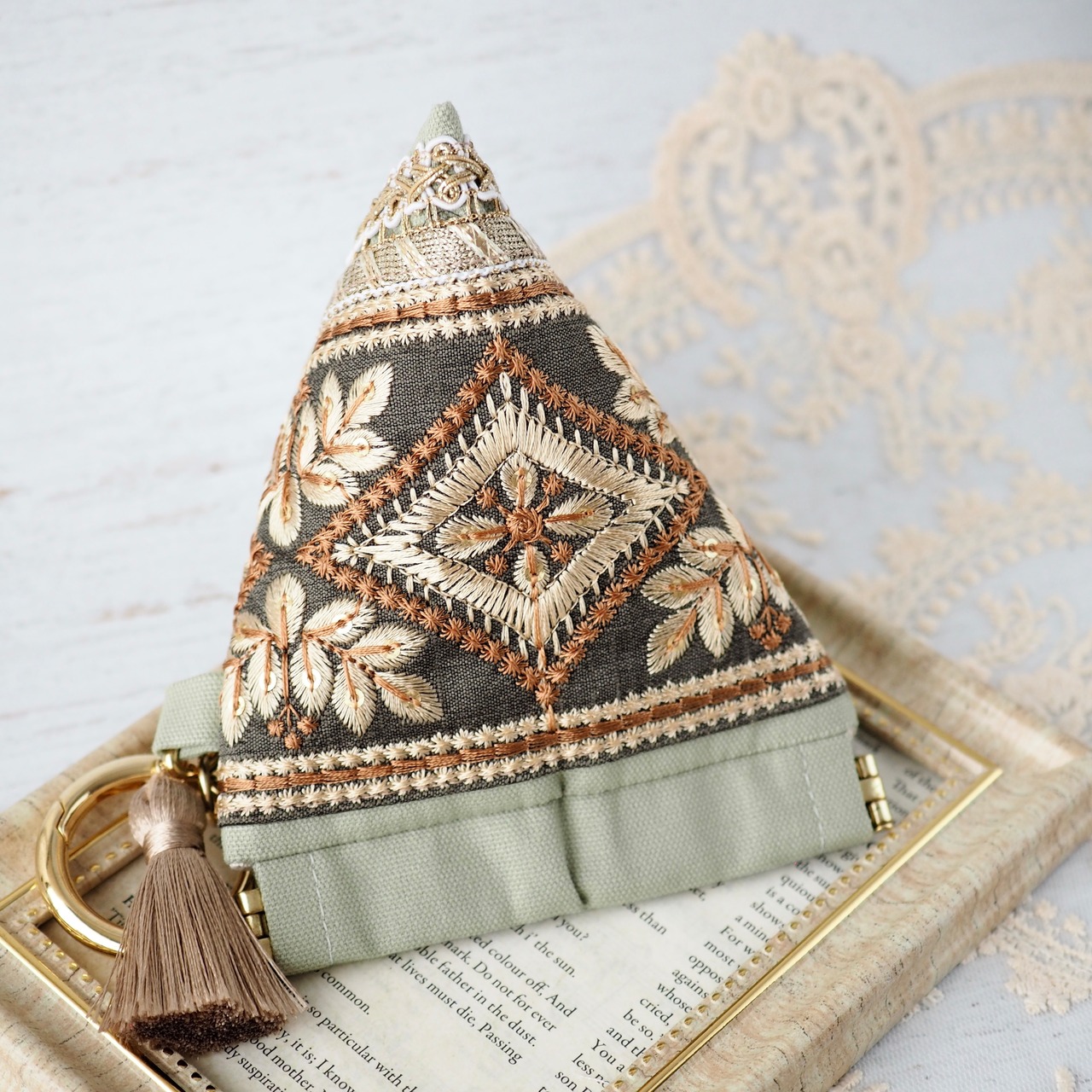 華やかなインド刺繍リボンを主役に、手に取るたび気分が上がる一品に仕立てました。