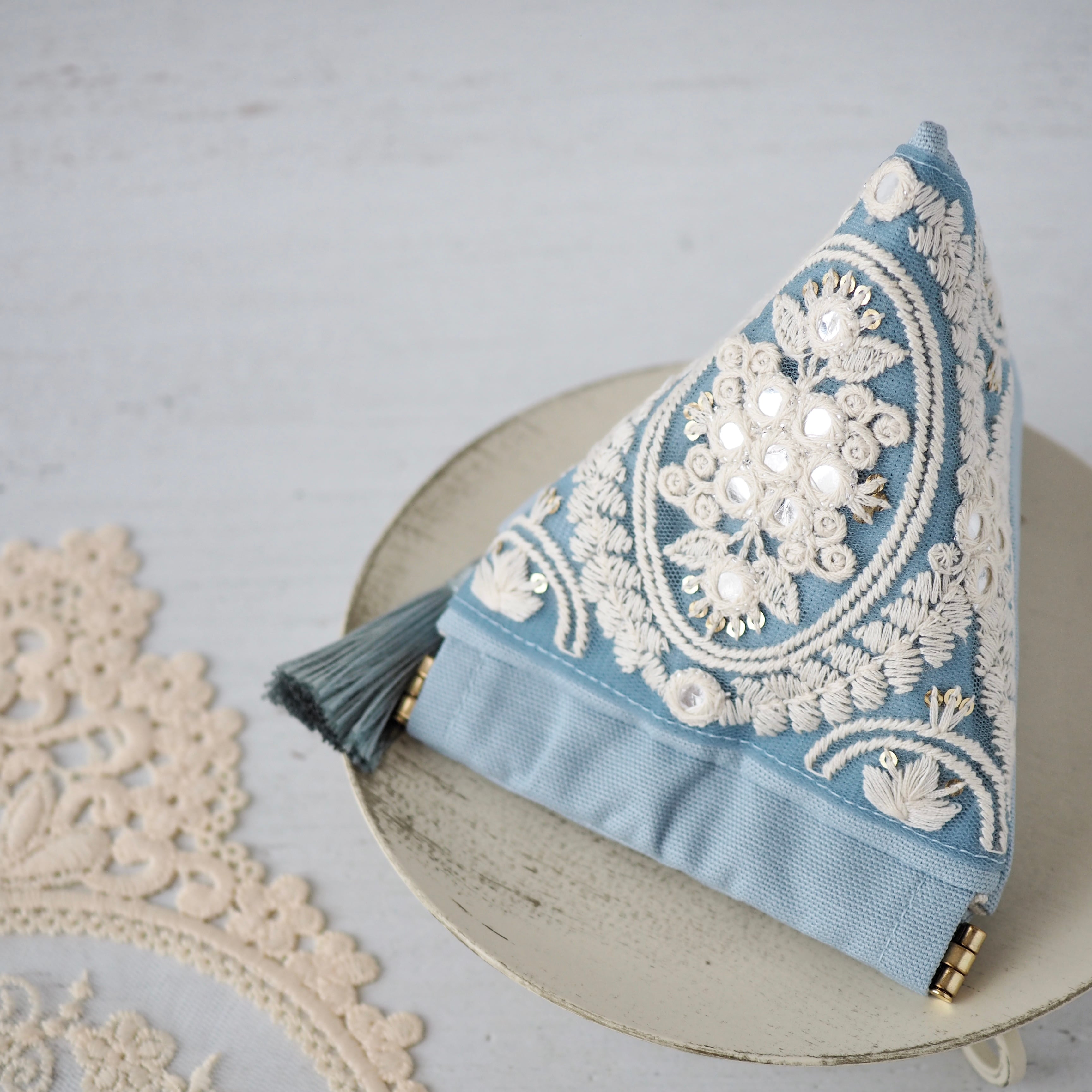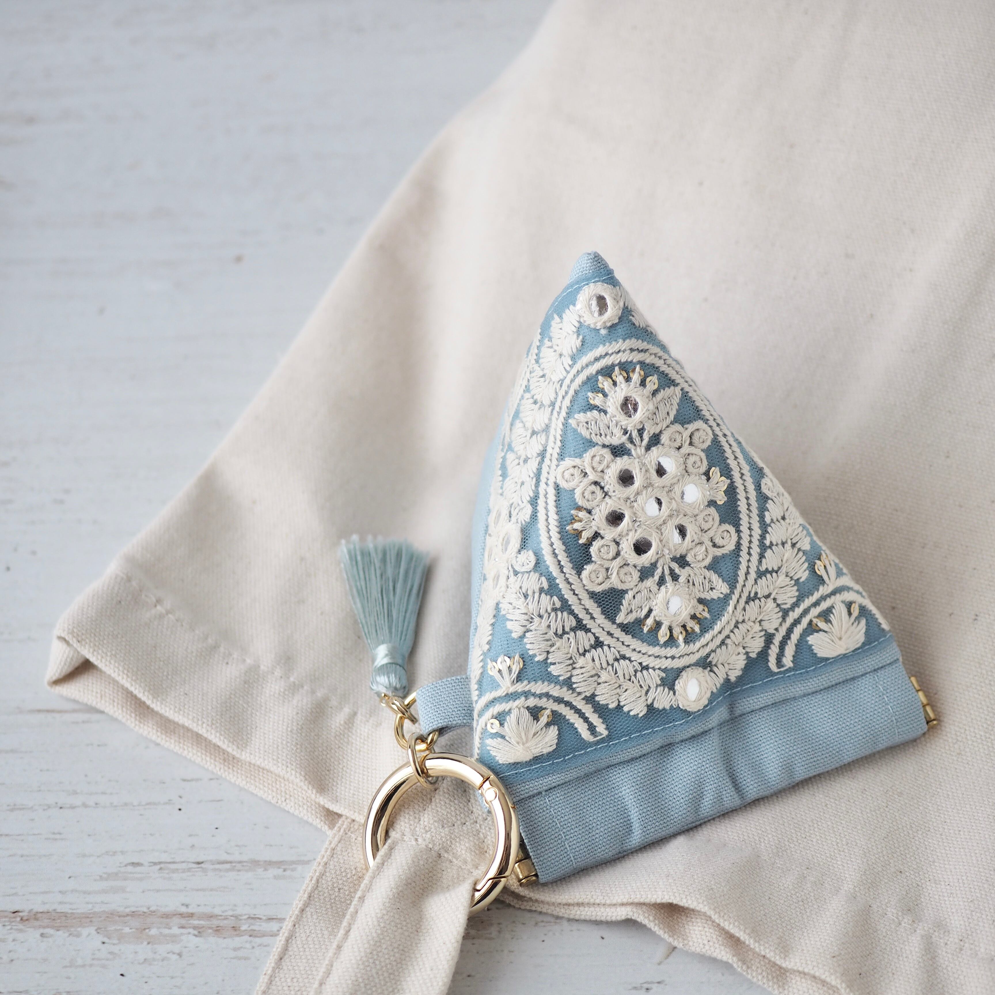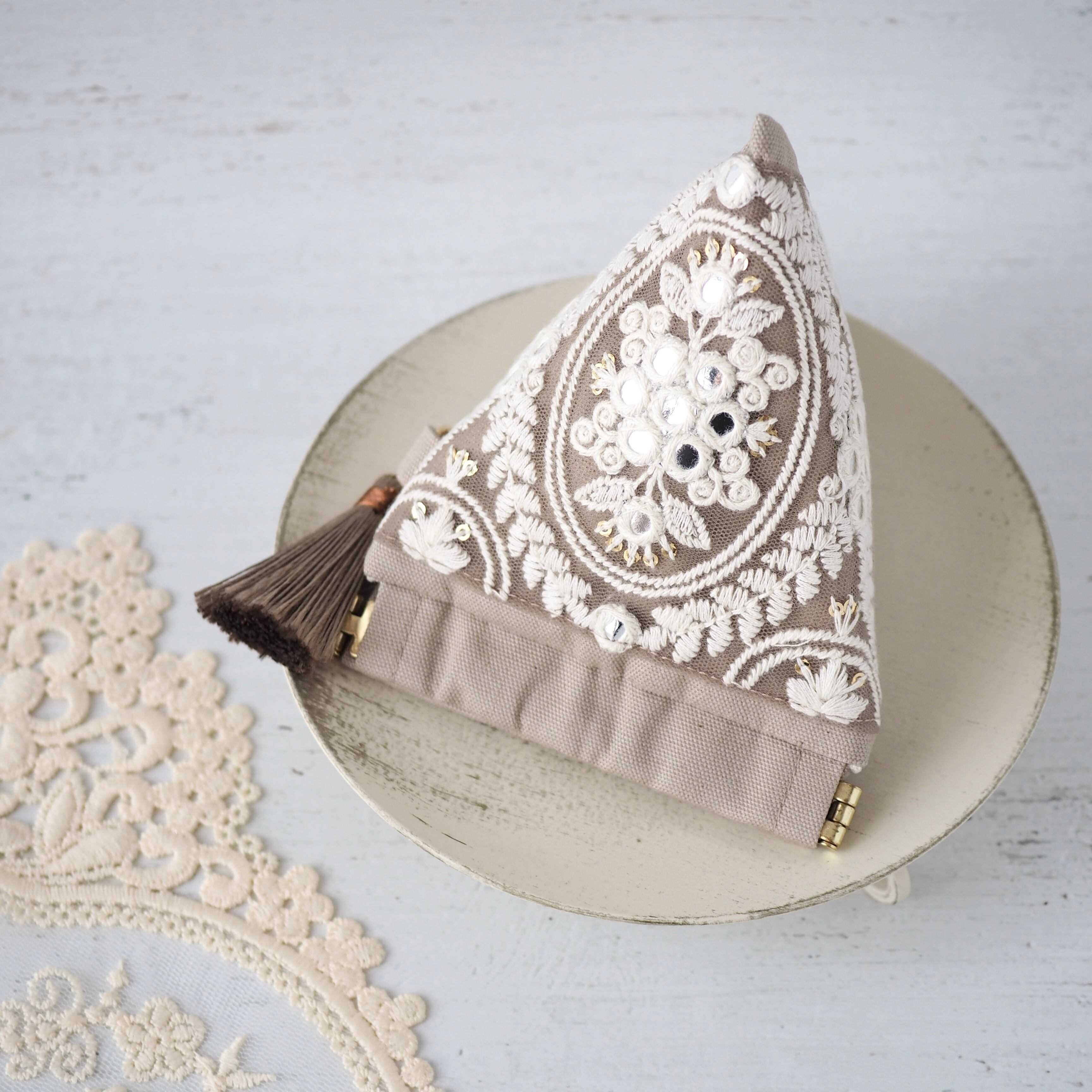 華やかなインド刺繍リボンを主役に、手に取るたび気分が上がる一品に仕立てました。