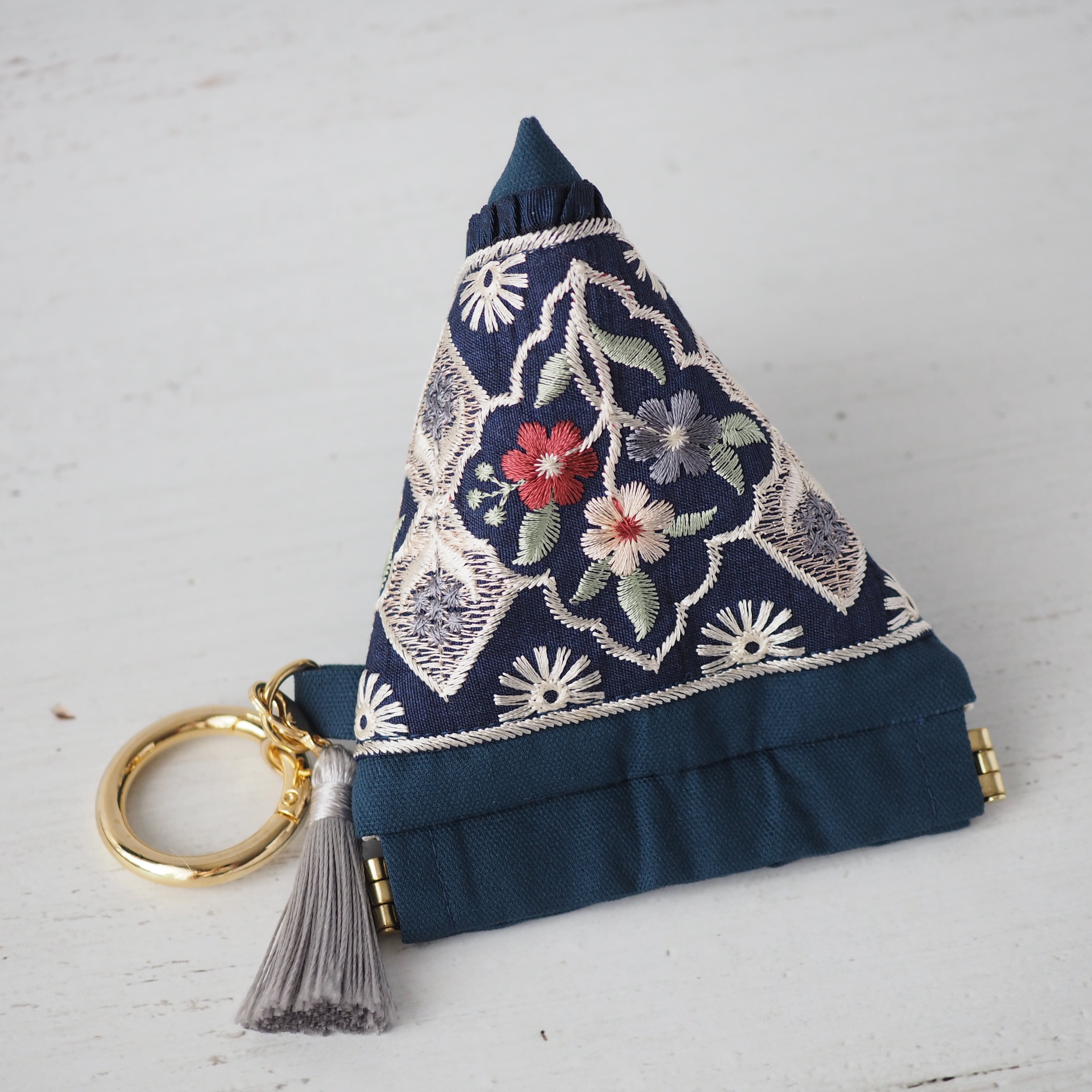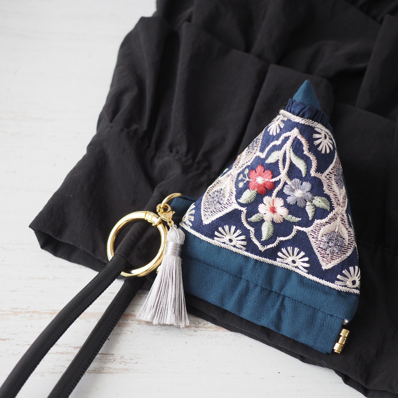 華やかなインド刺繍リボンを主役に、手に取るたび気分が上がる一品に仕立てました。