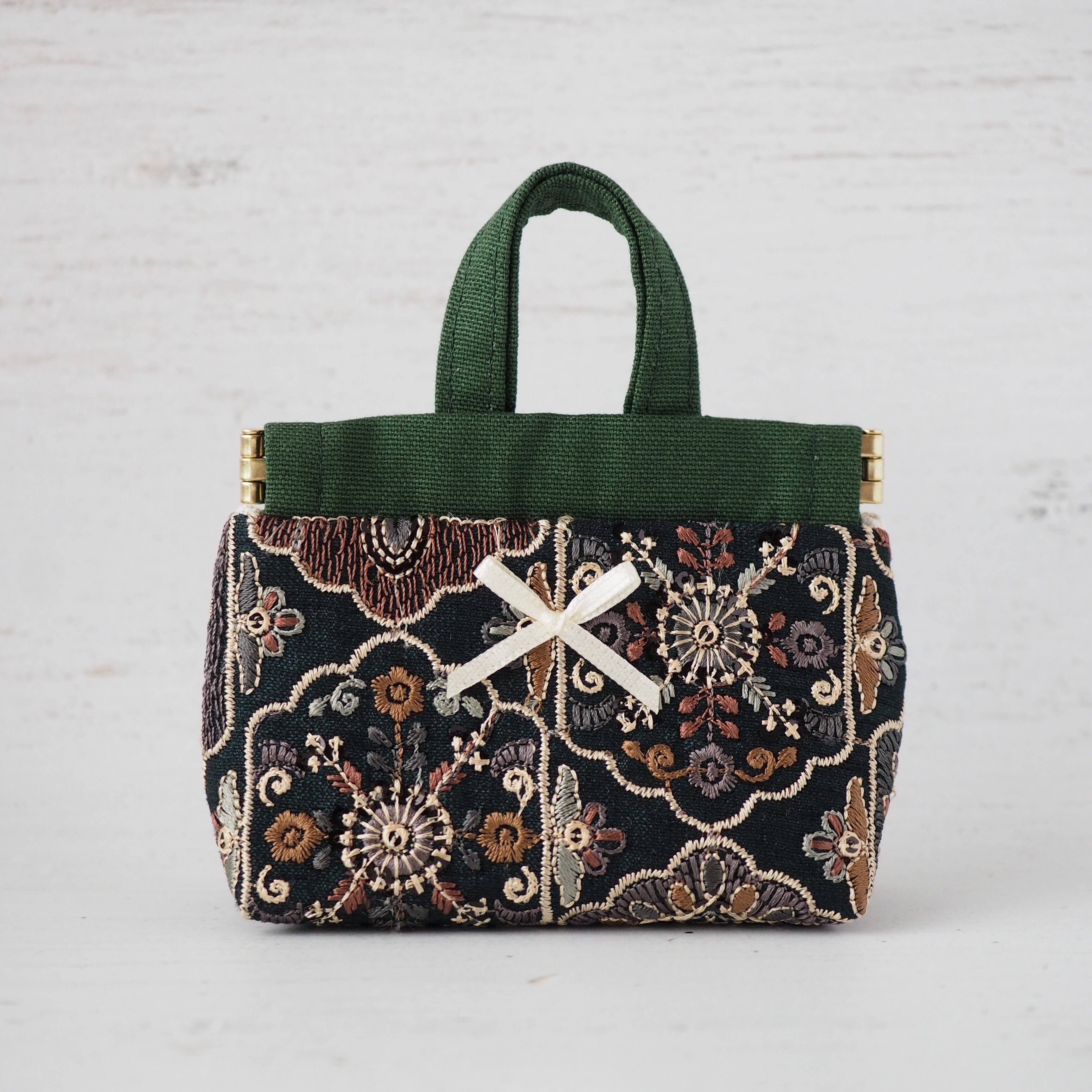 ふっくらとしたシルエットに、華やかなインド刺繍生地を合わせて上品な印象に仕上げました。