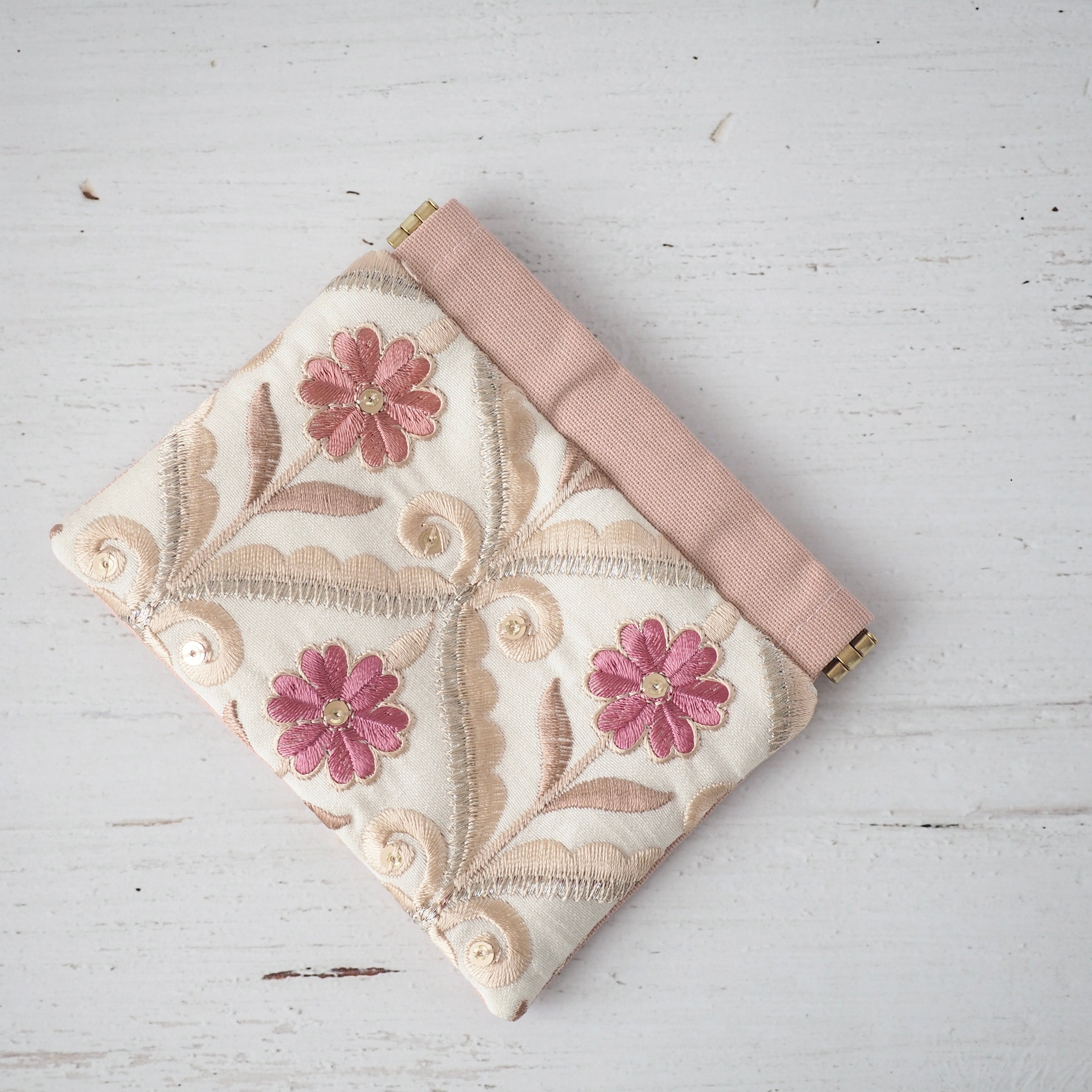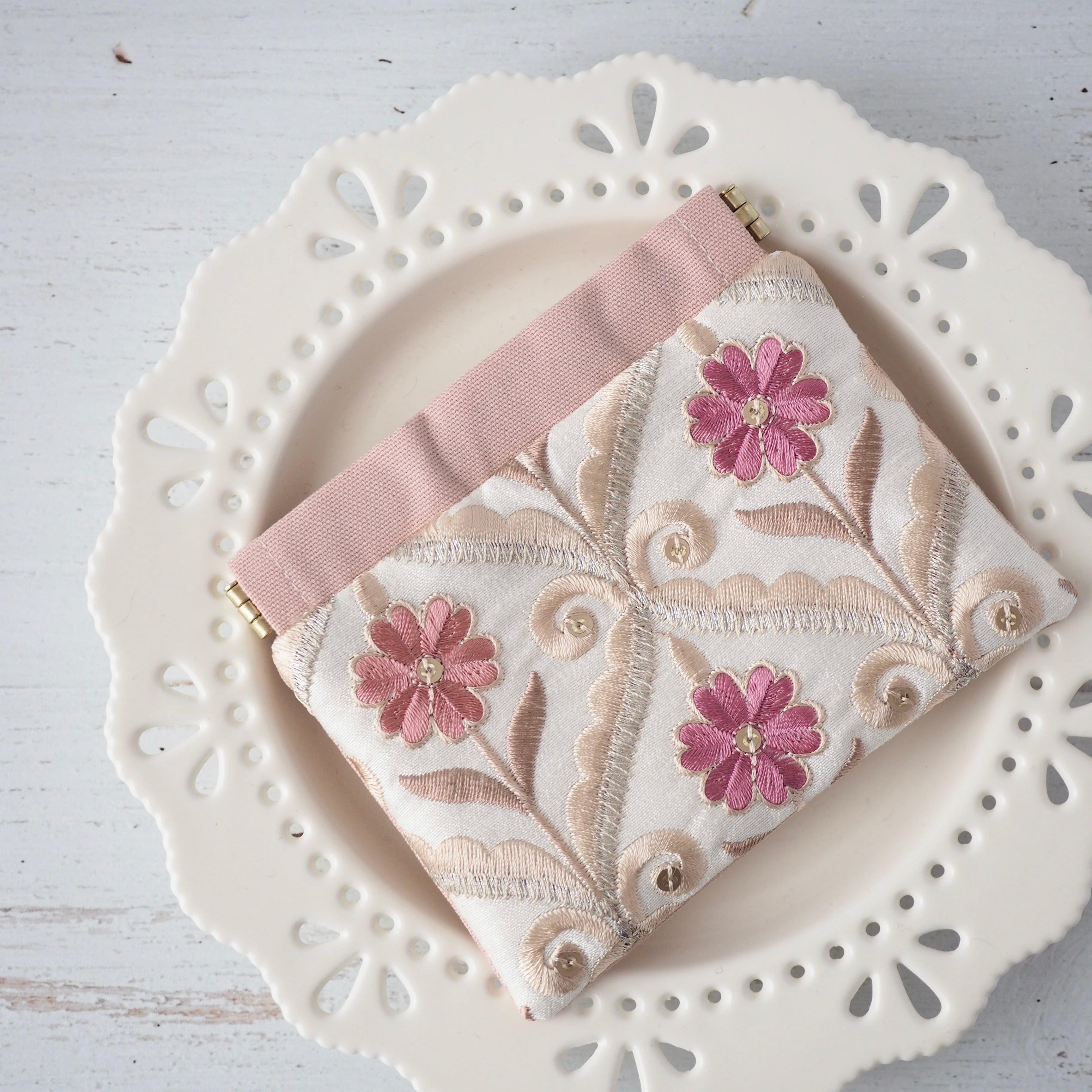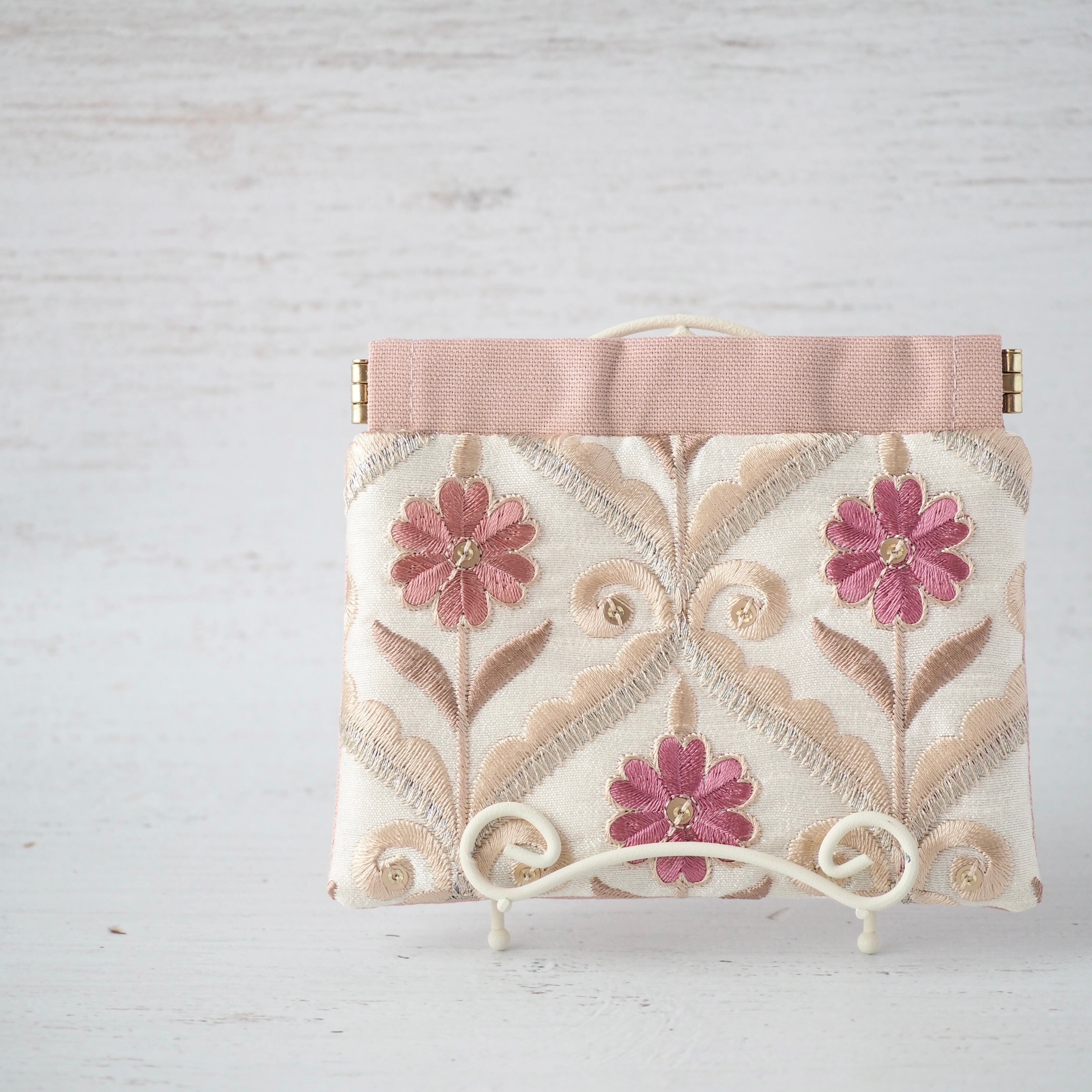 落ち着いたニュアンスカラーの刺繍生地が上品にきらめき、