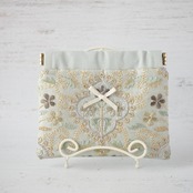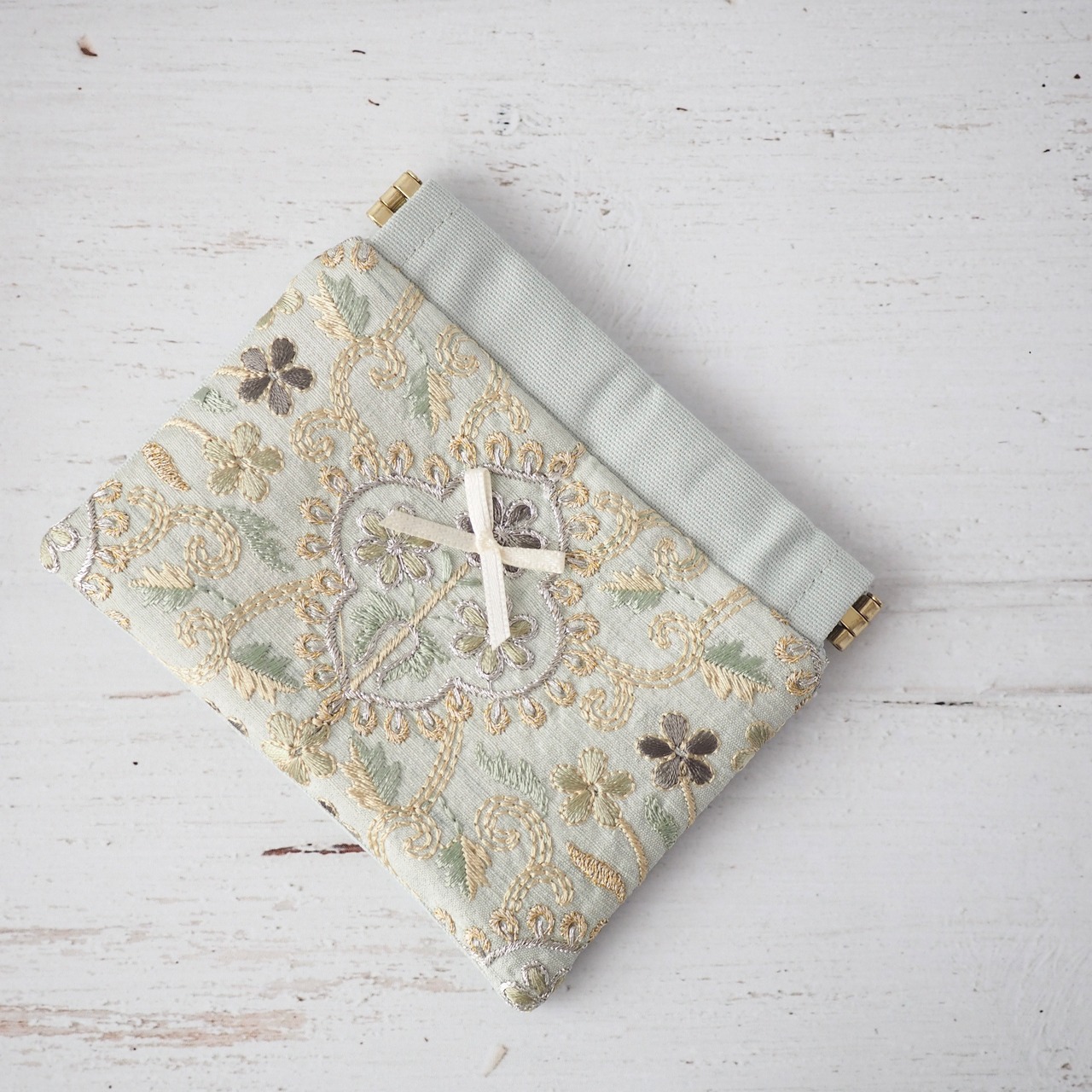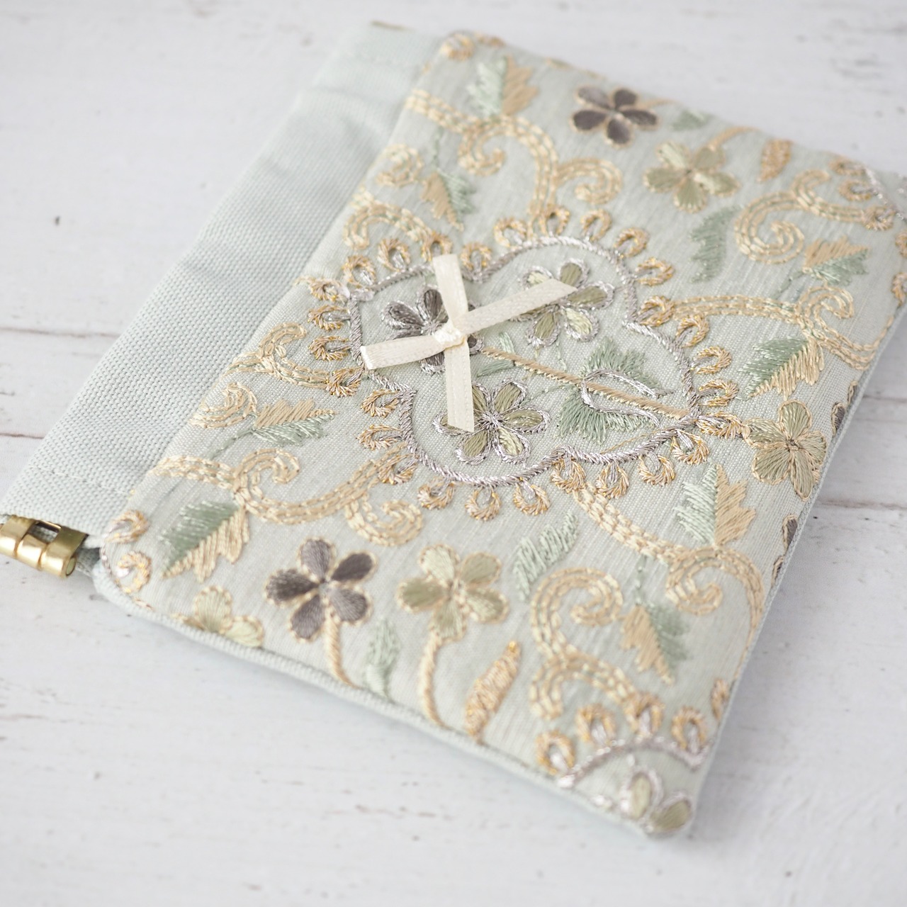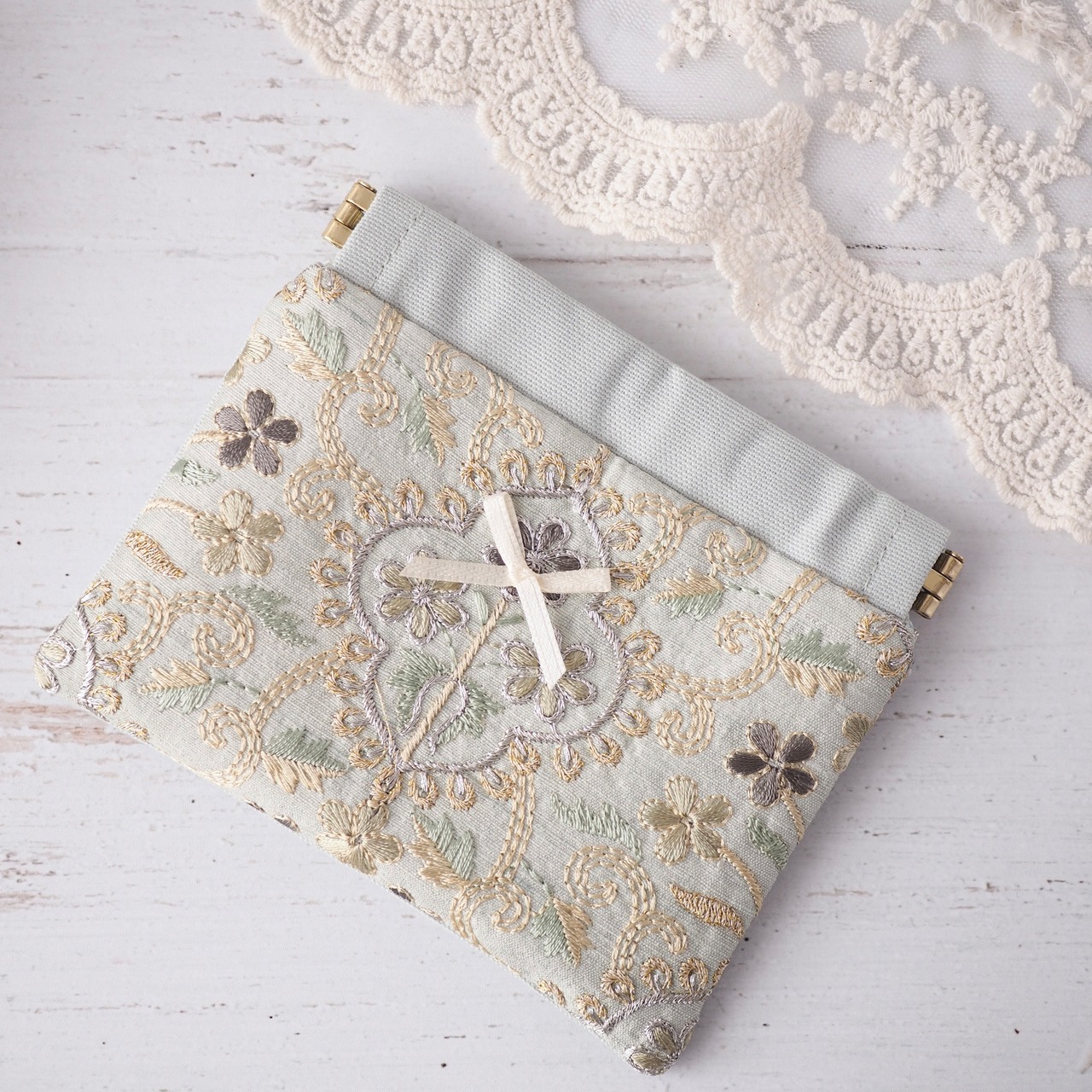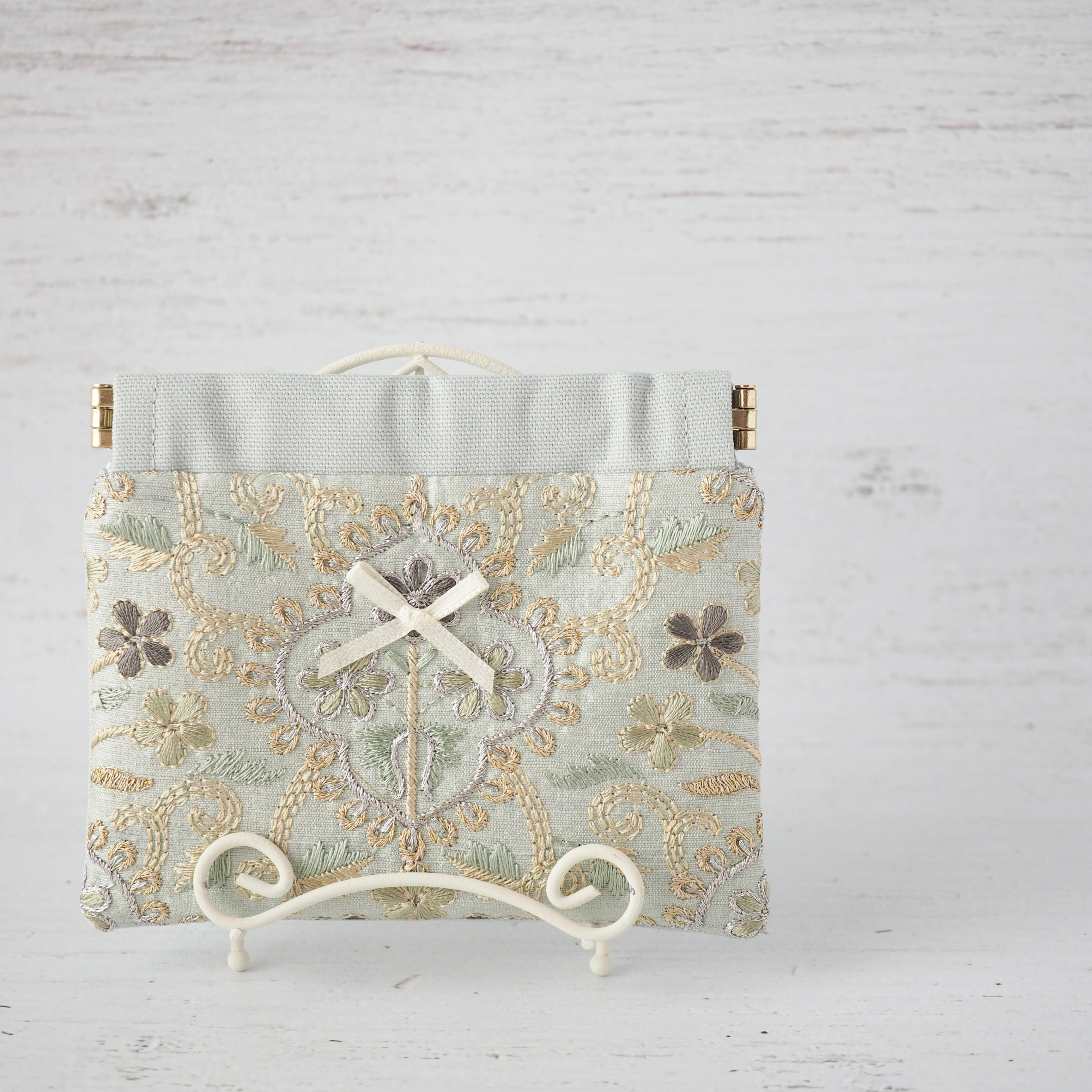 落ち着いたニュアンスカラーの刺繍生地が上品にきらめき、