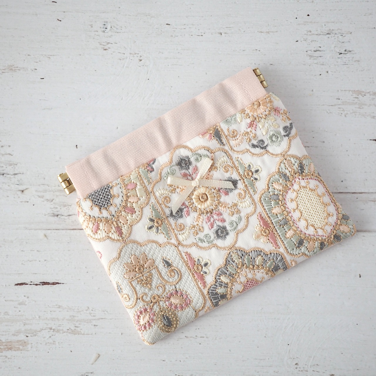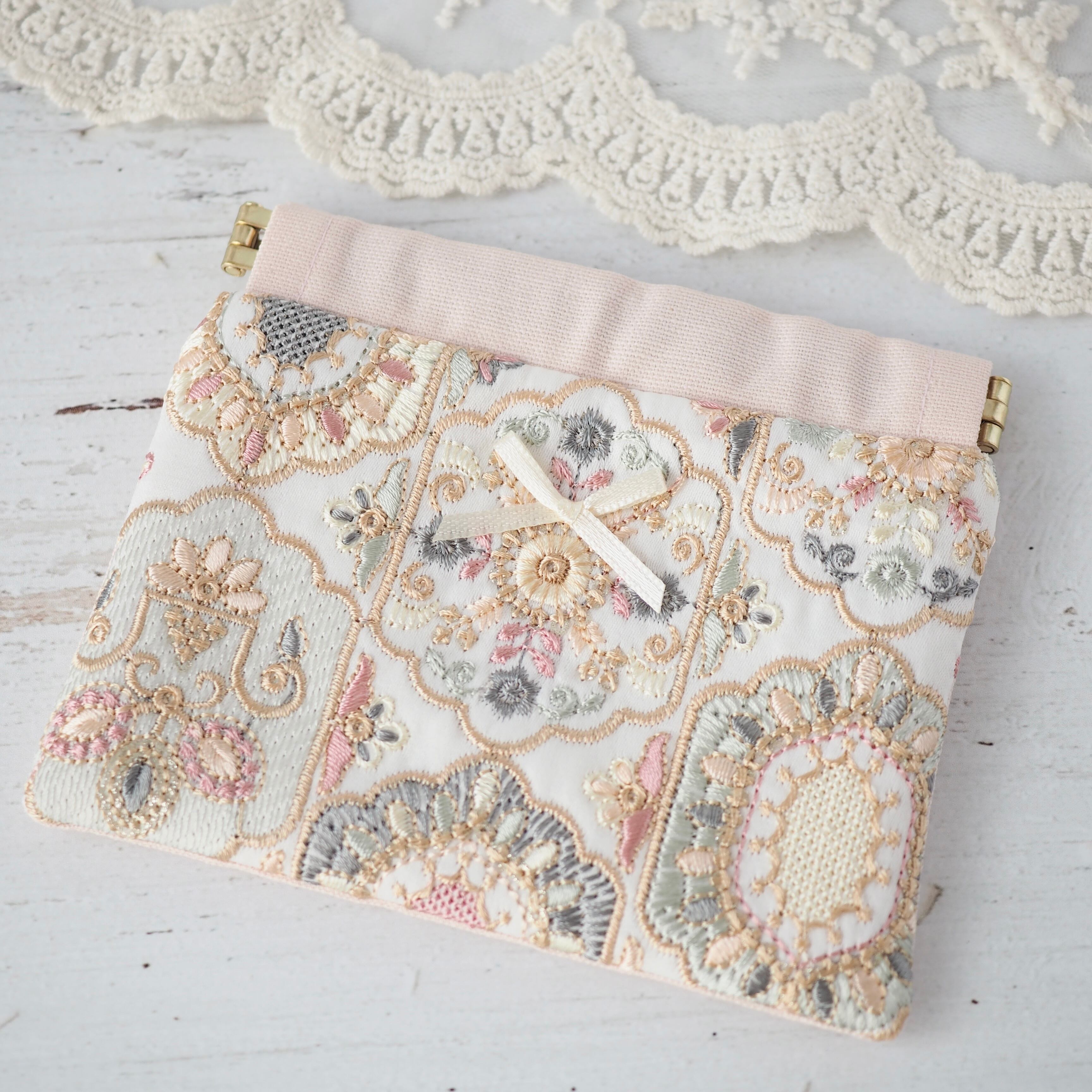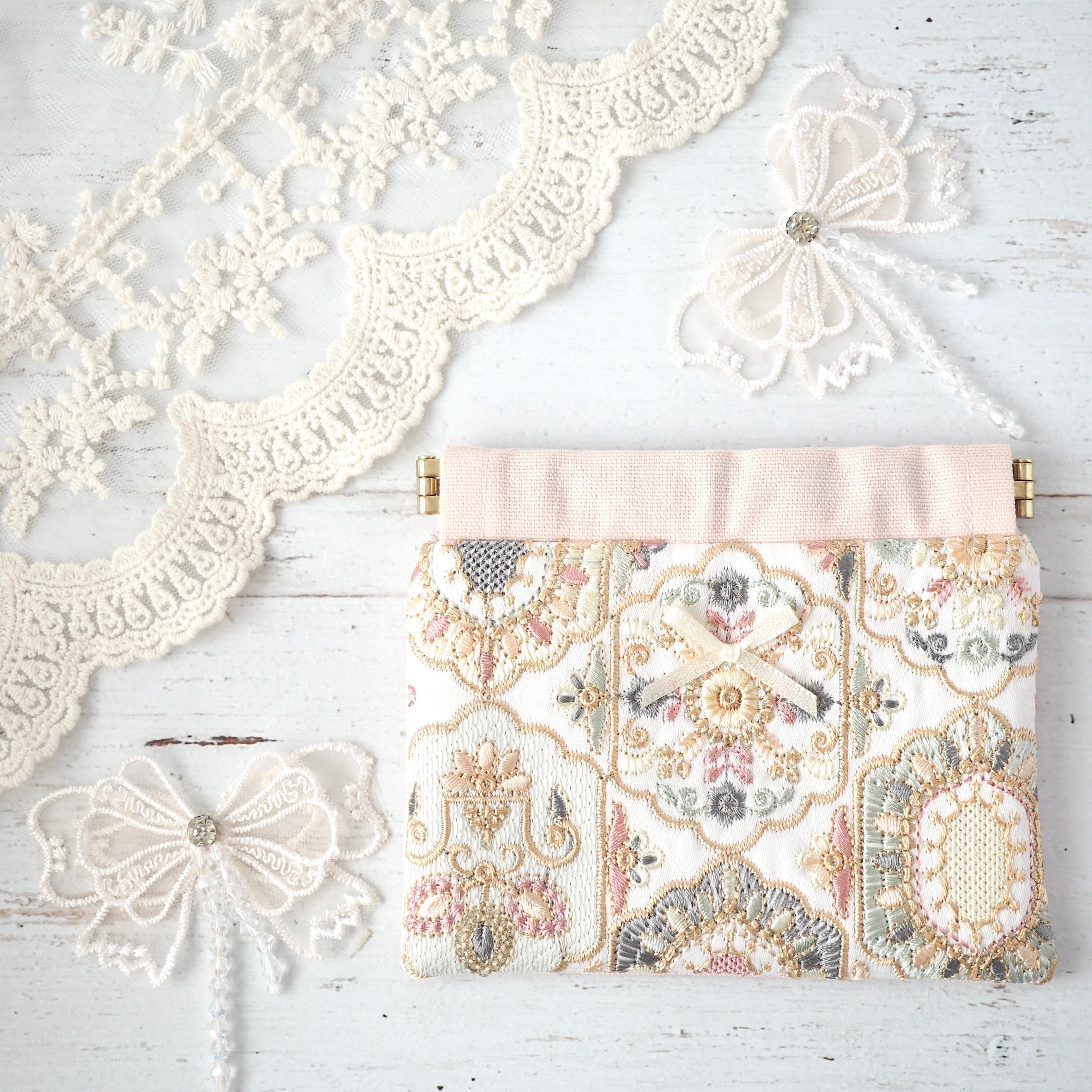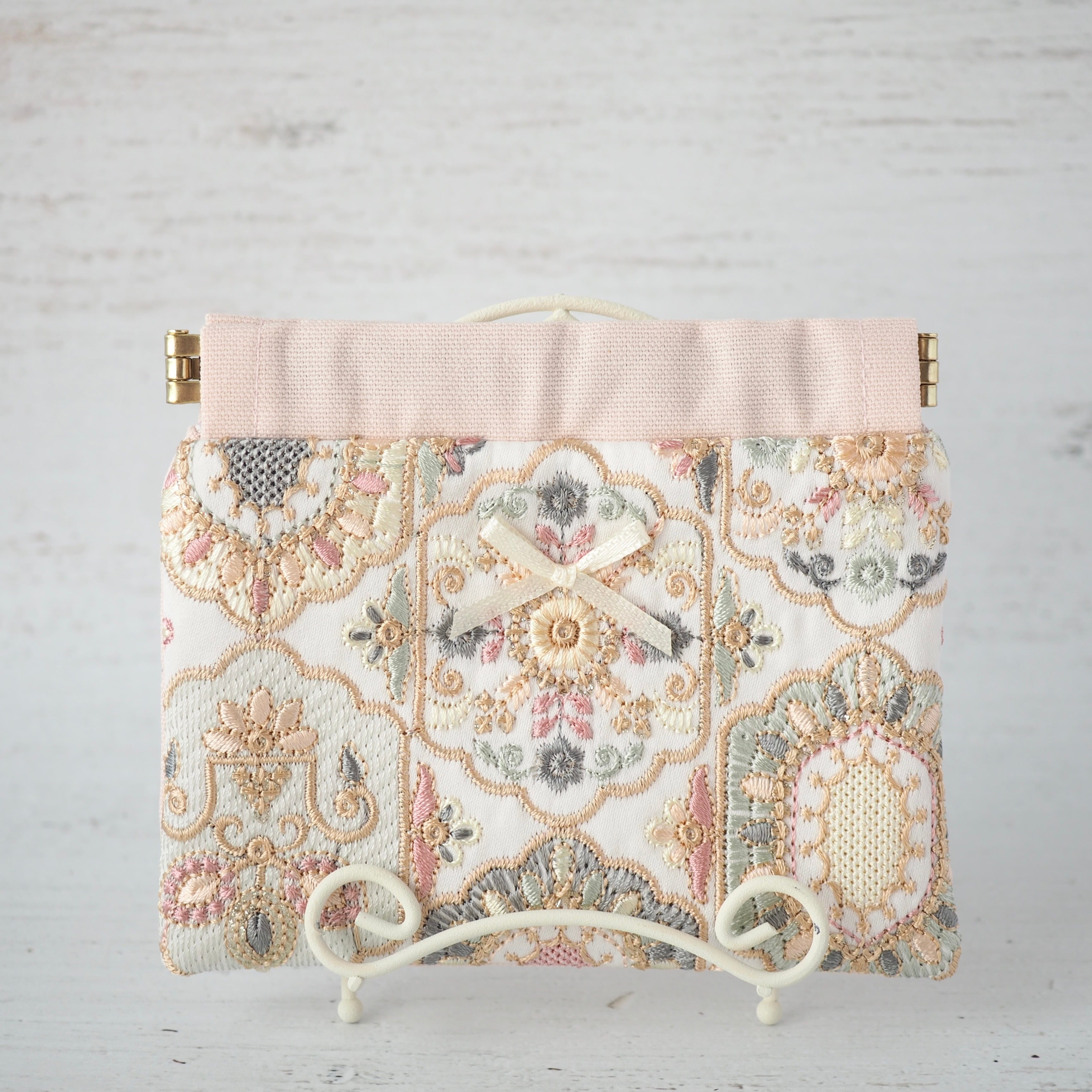 落ち着いたニュアンスカラーの刺繍生地が上品にきらめき、