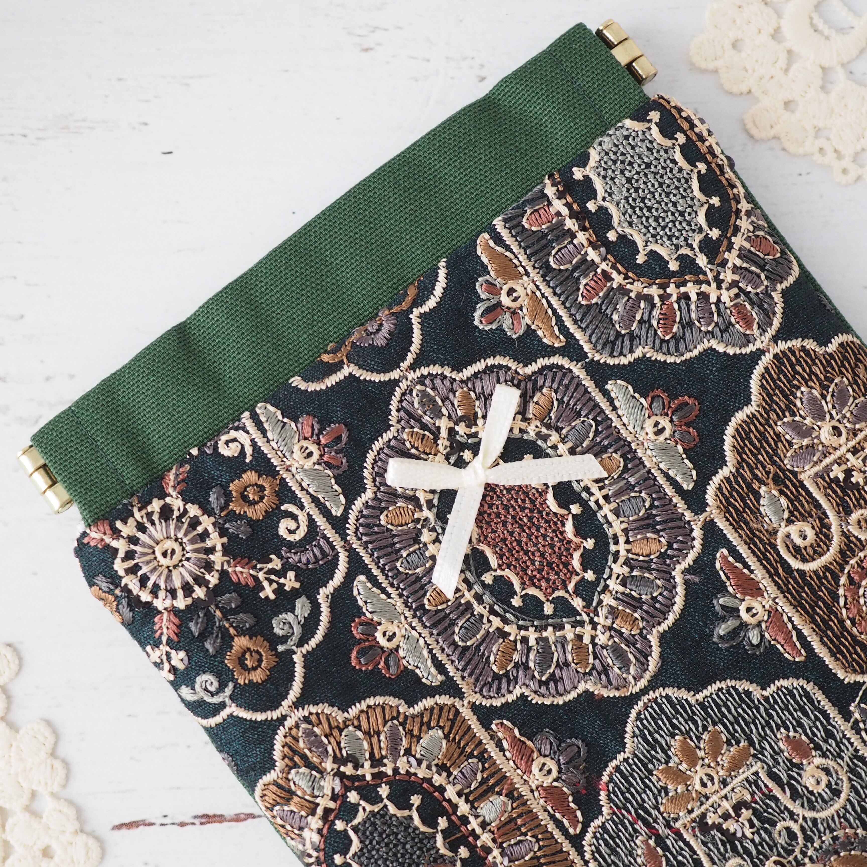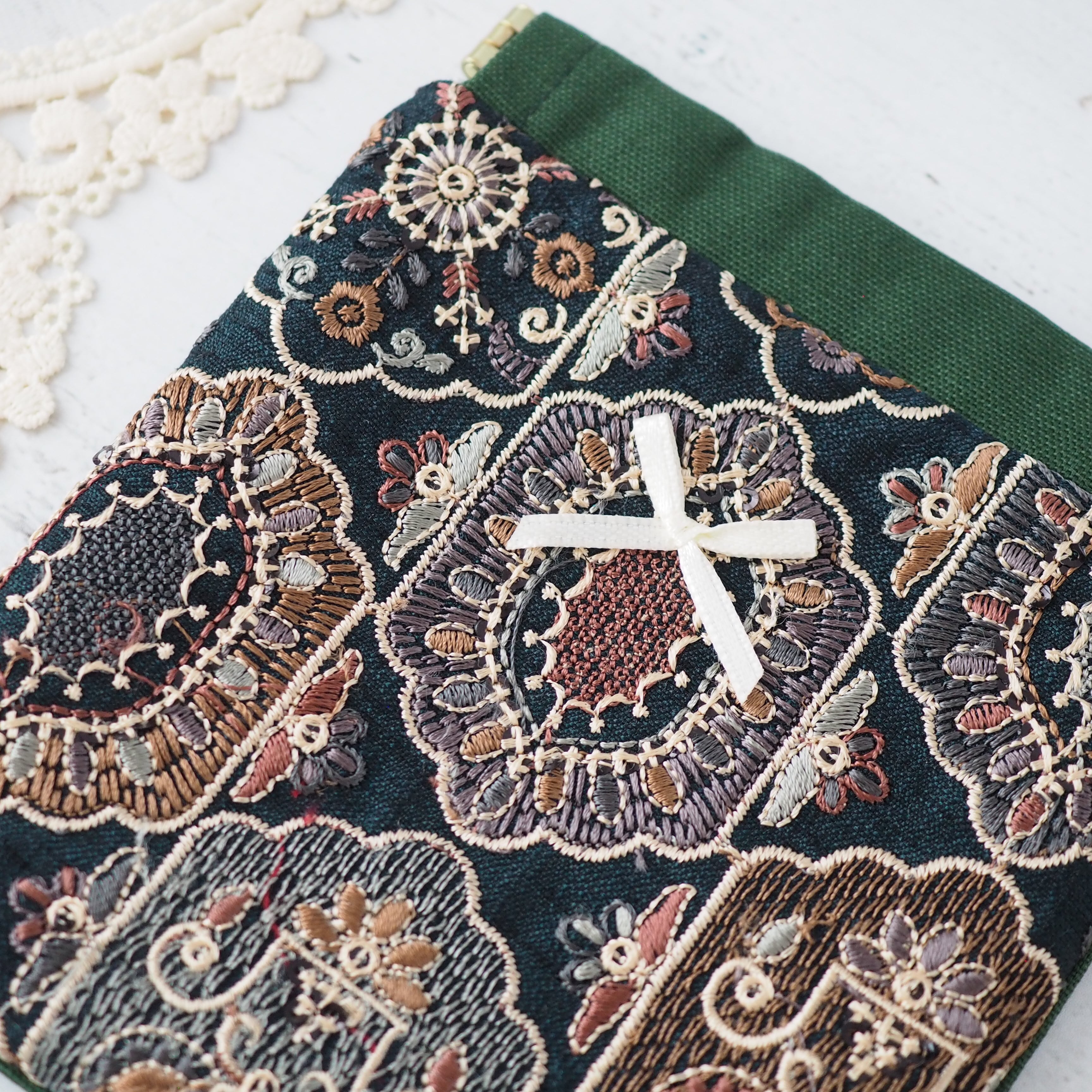 インド刺繍生地の華やかさとやさしいニュアンスカラーを組み合わせた、Link.hand-madeのこだわりポーチ。